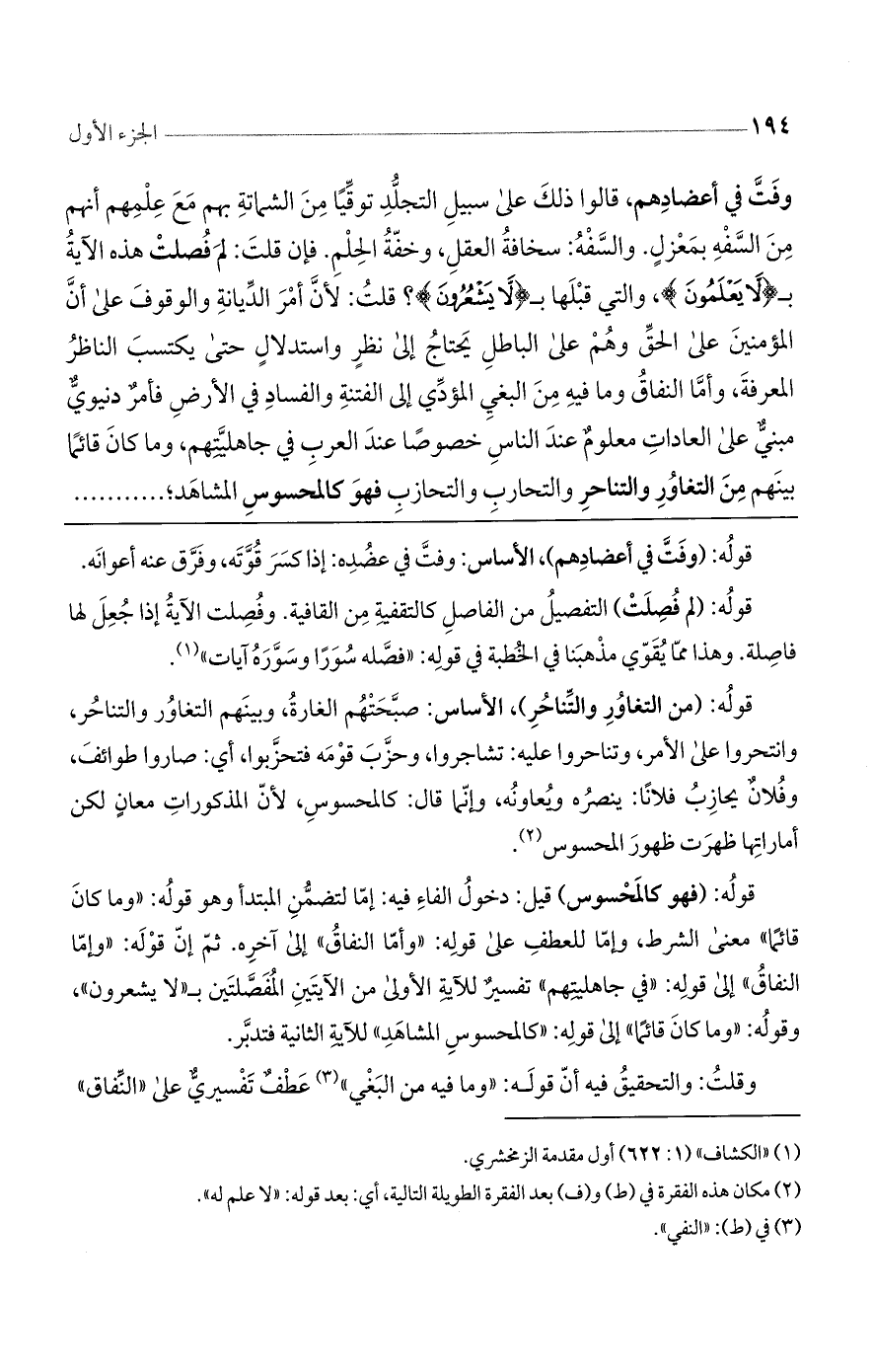 قوله: (فهو كالمحسوس) قيل: دخول الفاء فيه: إما لتضمن المبتدأ وهو قوله: ((وما كان قائماً)) معنى الشرط، وإما للعطف على قوله: ((وأما النفاق)) إلى آخره. ثم إن قوله: ((وإما النفاق)) إلى قوله: ((في جاهليتهم)) تفسيرٌ للآية الأولى من الآيتين المفصلتين ب ((لا يشعرون))، وقوله: ((وما كان قائماً)) إلى قوله: ((كالمحسوس المشاهد)) للآية الثانية فتدبر.