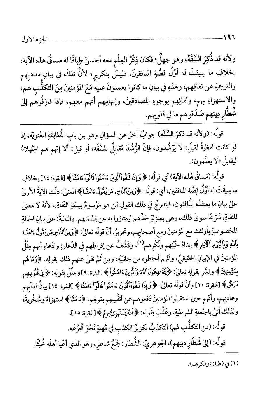قوله: (ولأنه قد ذكر السفه) جوابٌ آخر عن السؤال وهو من باب المطابقة المعنوية، إذ لو كانت لفظيةً لقيل: لا يرشدون، فإن الرشد مقابلٌ للسفه، أو قيل: ألا إنهم هم الجهلاء ليقابل ((لا يعلمون)).