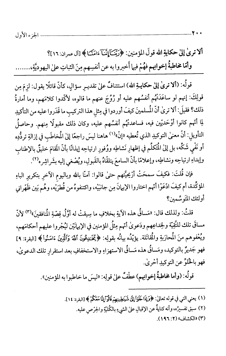 قوله: (ألا ترى إلى حكاية الله) استئنافٌ على تقدير سؤالٍ، كأن قائلاً يقول: لزم من قولك: إنهم لو ساعدتهم أنفسهم عليه أو روج عنهم ما قالوه، لأكدوا كلامهم، وما أمارة ذلك؟ فقيل: ألا ترى أن المسلمين كيف أوردوا في مثل هذا التركيب ما قدروا عليه من التأكيد لنا أنهم كانوا أوحديين فيه، فساعدتهم أنفسهم عليه، وكان ذلك مقبولاً منهم. وحاصل التأويل: أن معنى التوكيد الذي تعطيه ((إن)) ها هنا ليس راجعاً إلى المخاطب في إزالة تردده أو نفي شكه، بل إلى المتكلم في إظهار نشاطه ووفور ارتياحه إيذاناً بأن المقام خليقٌ بالإطناب وإبداء ارتياحه ونشاطه، وإعلاماً بأن السامع يتلقاه بالقبول، ويصغي إليه بشراشره.