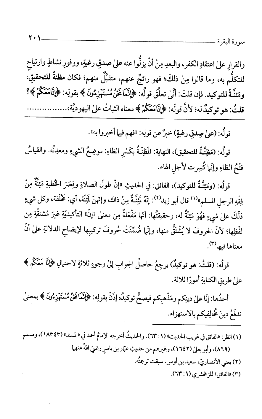والقرار على اعتقاد الكفر، والبعد من أن يزلوا عنه على صدق رغبة ووفور نشاط وارتياح للتكلم به، وما قالوه من ذلك فهو رائج عنهم متقبل منهم، فكان مظنة للتحقيق ومئنة للتوكيد. فإن قلت: أنى تعلق قوله: (إِنَّما نَحْنُ مُسْتَهْزِؤُنَ) بقوله: (إِنَّا مَعَكُمْ)؟ قلت: هو توكيد له؛ لأن قوله: (إِنَّا مَعَكُمْ) معناه الثبات على اليهودية، .......