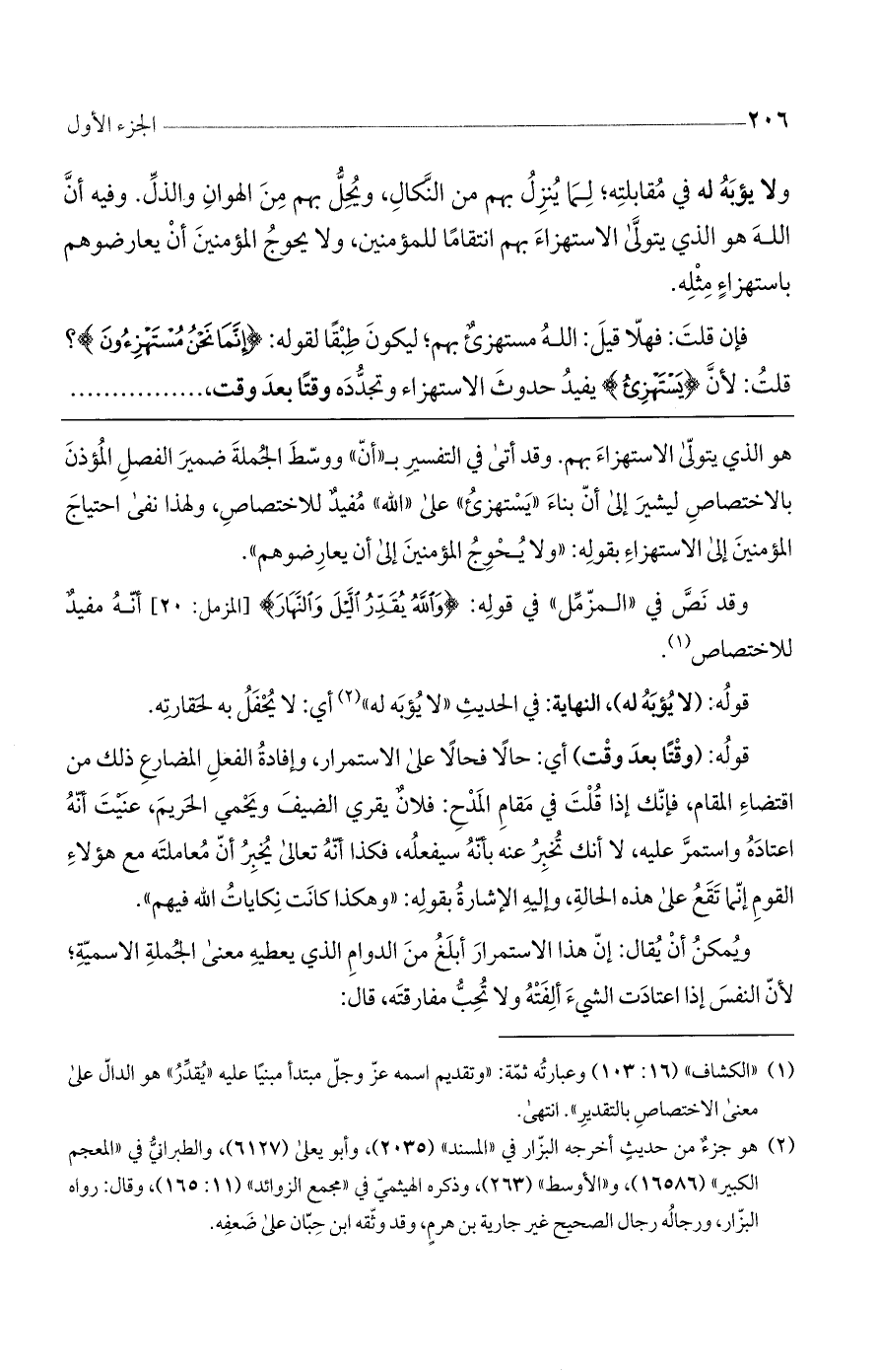 هو الذي يتولى الاستهزاء بهم. وقد أتى في التفسير ب ((أن)) ووسط الجملة ضمير الفصل المؤذن بالاختصاص ليشير إلى أن بناء ((يستهزئ)) على ((الله)) مفيدٌ للاختصاص، ولهذا نفى احتياج المؤمنين إلى الاستهزاء بقوله: ((ولا يحوج المؤمنين إلى أن يعارضوهم)).