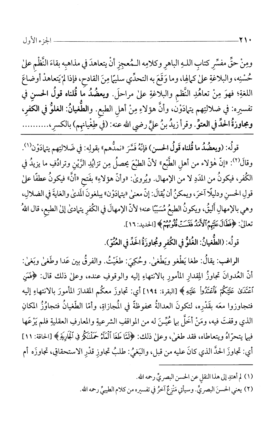 ومن حق مفسر كتاب اللَّه الباهر وكلامه المعجز، أن يتعاهد في مذاهبه بقاء النظم على حسنه والبلاغة على كمالها وما وقع به التحدّى سليما من القادح، فإذا لم يتعاهد أوضاع اللغة فهو من تعاهد النظم والبلاغة على مراحل. ويعضد ما قلناه قول الحسن في تفسيره: في ضلالتهم يتمادون، وأن هؤلاء من أهل الطبع. والطغيان: الغلو في الكفر، ومجاوزة الحدّ في العتوّ. وقرأ زيد بن على رضى اللَّه عنه: (في طغيانهم) بالكسر