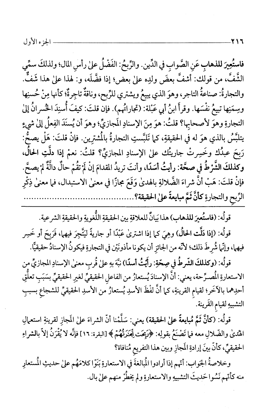 قوله: (كأن ثم مبايعةً على الحقيقة) يعني: سلمنا أن الشراء على المجاز لقرينة استعمال الهدى والضلالة معه فيما تصنع بقوله: (رَبِحَت تِّجَارَتُهُمْ) [البقرة: 16] فإنه لا يقرن إلا بالشراء الحقيقي، كأن بين إرادة المجاز وبين هذا التفريغ منافاة؟