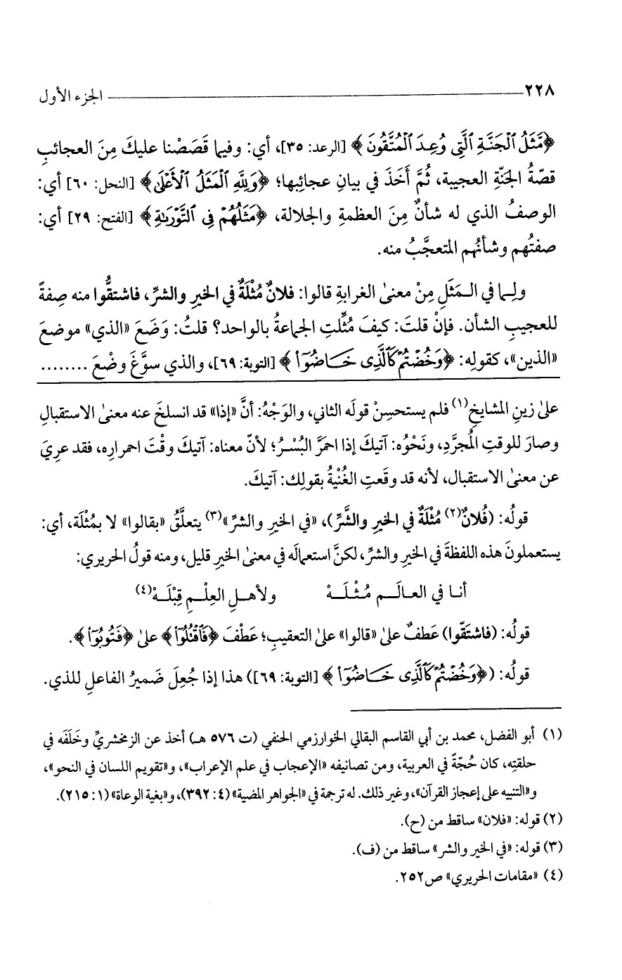 (مَثَلُ الْجَنَّةِ الَّتِي وُعِدَ الْمُتَّقُونَ) [الرعد: 35]، أى وفيما قصصنا عليك من العجائب: قصة الجنة العجيبة. ثم أخذ في بيان عجائبها؛ (وللَّه المثل الأعلى) [النحل: 60] أي: الوصف الذي له شأن من العظمة والجلالة. (مَثَلُهُمْ فِي التَّوْراةِ) [الفتح: 29] أي: صفتهم وشأنهم المتعجب منه.