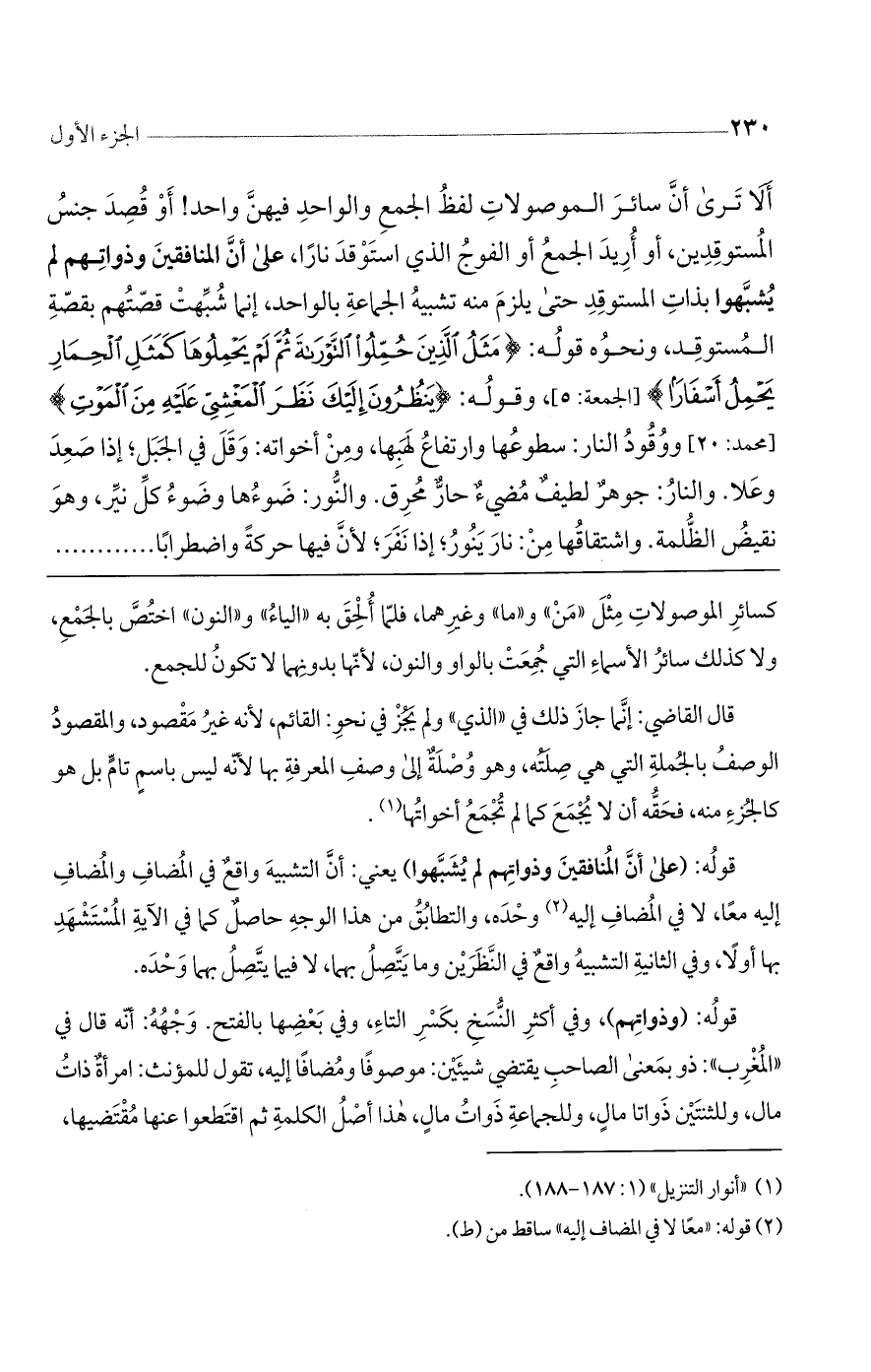 ألا ترى أن سائر الموصولات لفظ الجمع، والواحد فيهن واحد. أو قصد جنس المستوقدين. أو أريد الجمع أو الفوج الذي استوقد نارا. على أنّ المنافقين وذواتهم لم يشبهوا بذات المستوقد حتى يلزم منه تشبيه الجماعة بالواحد إنما شبهت قصتهم بقصة المستوقد. ونحوه قوله: (مَثَلُ الَّذِينَ حُمِّلُوا التَّوْراةَ ثُمَّ لَمْ يَحْمِلُوها كَمَثَلِ الْحِمارِ يَحْمِلُ أَسْفاراً) [الجمعة: 5]، وقوله: (يَنْظُرُونَ إِلَيْكَ نَظَرَ الْمَغْشِيِّ عَلَيْهِ مِنَ الْمَوْتِ) [محمد: 20] ووقود النار: سطوعها وارتفاع لهبها. ومن أخواته: وقل في الجبل إذا صعد وعلا، والنار: جوهر لطيف مضيء حارّ محرق. والنور: ضوءها وضوء كل نير، وهو نقيض الظلمة. واشتقاقها من نار ينور إذا نفر لأنّ فيها حركة واضطرابا