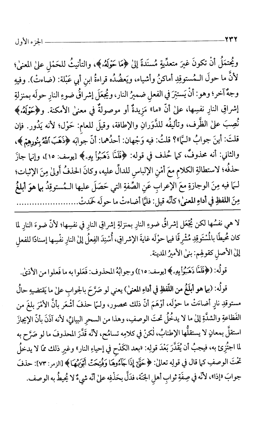 ويحتمل أن تكون غير متعدية مسندة إلى (ما حوله). والتأنيث للحمل على المعنى لأنّ ما حول المستوقد أماكن وأشياء. ويعضده قراءة ابن أبى عبلة (ضاءت). وفيه وجه آخر، وهو أن يستتر في الفعل ضمير النار. ويجعل إشراق ضوء النار حوله بمنزلة إشراق النار نفسها، على أنّ ما مزيدة أو موصولة في معنى الأمكنة. و (حَوْلَهُ) نصب على الظرف وتأليفه للدوران والإطافة. وقيل للعام: حول لأنه يدور. فإن قلت: أين جواب لما؟ قلت: فيه وجهان: أحدهما أن جوابه ذَهَبَ اللَّهُ بِنُورِهِمْ. والثاني: أنه محذوف كما حذف في قوله: (فَلَمَّا ذَهَبُوا بِهِ). وإنما جاز حذفه لاستطالة الكلام مع أمن الإلباس للدالّ عليه، وكان الحذف أولى من الإثبات لما فيه من الوجازة، مع الإعراب عن الصفة التي حصل عليها المستوقد بما هو أبلغ من اللفظ في أداء المعنى، كأنه قيل: فلما أضاءت ما حوله خمدت .....