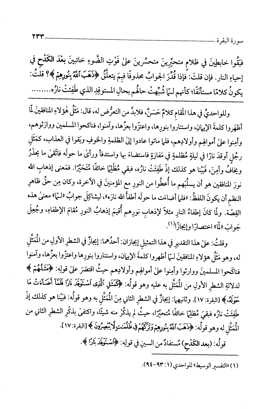 وللواحدي في هذا المقام كلام حسن، فلابد من التعرض له، قال: مثل هؤلاء المنافقين لما أظهروا كلمة الإيمان، واستناروا بنورها، واعتزوا بعزها، وآمنوا، فناكحوا المسلمين ووارثوهم، وأمنوا على أموالهم وأولادهم، فلما ماتوا عادوا إلى الظلمة والخوف وبقوا في العذاب، كمثل رجل أوقد نارًا في ليلة مظلمة في مفازة فاستضاء بها واستدفأ ورأى ما حوله فاتقى ما يحذر ويخاف وأمن، فبينا هو كذلك إذ طفئت ناره، فبقي مظلما خائفا متحيرا. فمعنى إذهاب الله نور المنافقين هو أن يسلبهم ما أعطوا من النور مع المؤمنين في الآخرة، وكان من حق ظاهر النظم أن يكون اللفظ: "فلما أضاءت ما حوله أطفأ الله ناره"، ليشاكل جواب "لما" معنى هذه القصة. ولما كان إطفاء النار مثلا لإذهاب نورهم أقيم إذهاب النور مقام الإطفاء، وجعل جواب "لما" اختصارًا وإيجازًا.