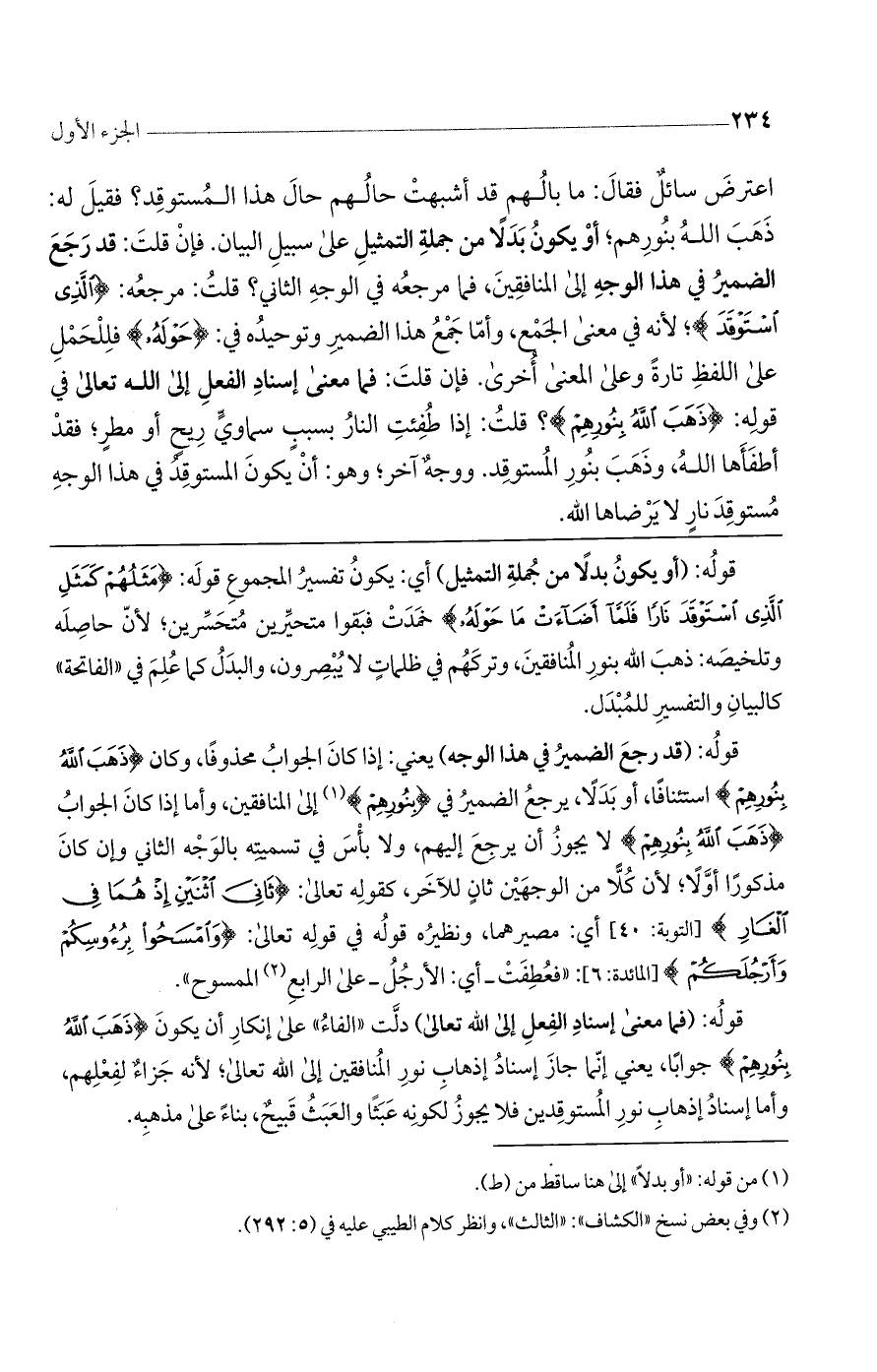 قوله: (قد رجع الضمير في هذا الوجه) يعني: إذا كان الجواب محذوفًا، وكان (ذَهَبَ اللَّهُ بِنُورِهِمْ) استئنافًا، أو بدلاً، يرجع الضمير في (بِنُورِهِمْ) إلى المنافقين، وأما إذا كان الجواب (ذَهَبَ اللَّهُ بِنُورِهِمْ) لا يجوز أن يرجع إليهم، ولا بأس في تسميته بالوجه الثاني وإن كان مذكورًا أولاً؛ لأن كلا من الوجهين ثانٍ للآخر، كقوله تعالى: (ثَانِيَ اثْنَيْنِ إذْ هُمَا فِي الغَارِ إذ) [التوبة: 40] أي: مصيرهما، ونظيره قوله في قوله تعالى: (وامْسَحُوا بِرُءُوسِكُمْ وأَرْجُلَكُمْ) [المائدة: 6]: "فعطفت- أي: الأرجل- على الرابع المسموح".