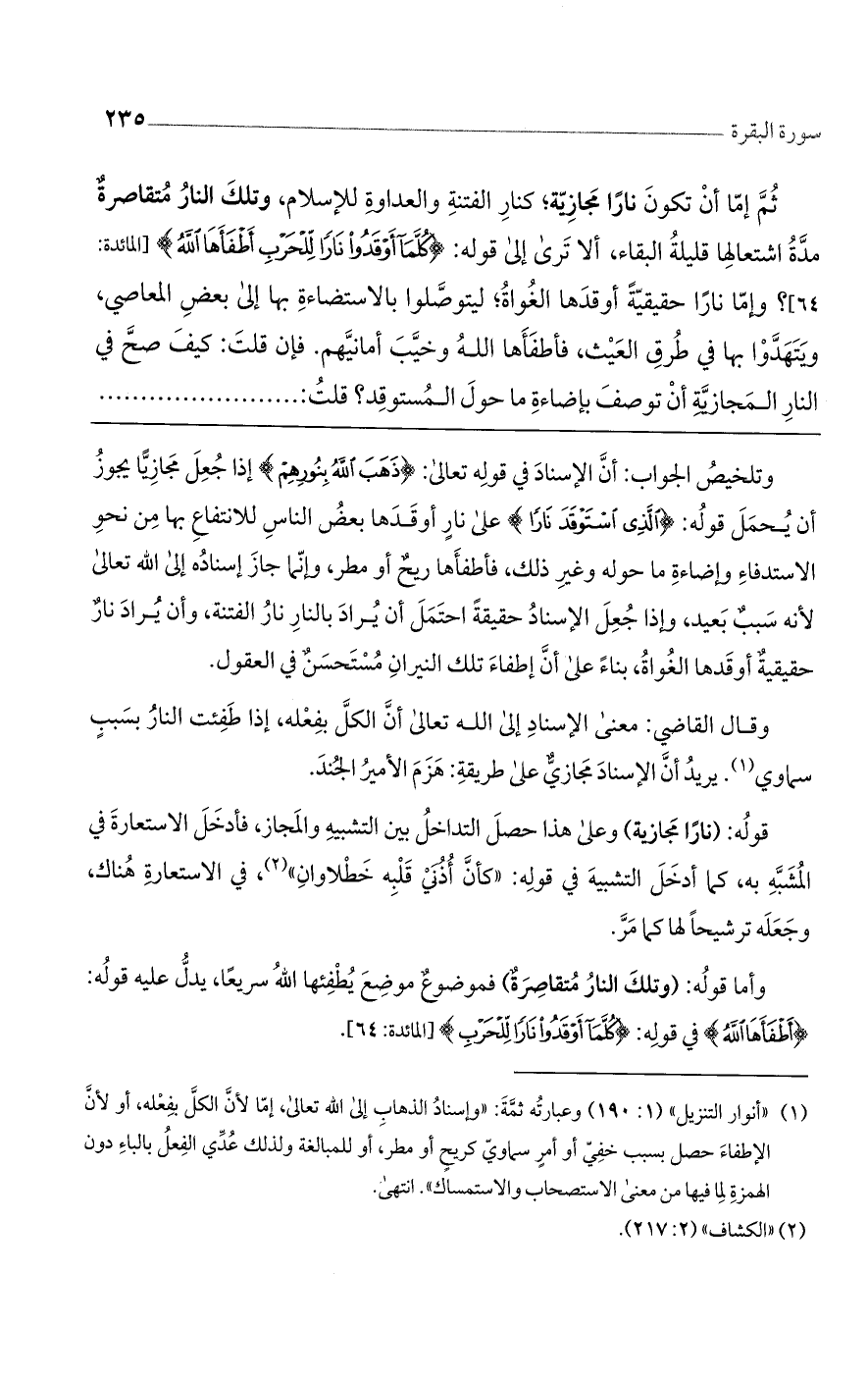 ثم إما أن تكون ناراً مجازية كنار الفتنة والعداوة للإسلام، وتلك النار متقاصرة مدّة اشتعالها قليلة البقاء. ألا ترى إلى قوله: (كُلَّما أَوْقَدُوا ناراً لِلْحَرْبِ أَطْفَأَهَا اللَّهُ) [المائدة: 64]، وإما ناراً حقيقية أوقدها الغواة ليتوصلوا بالاستضاءة بها إلى بعض المعاصي، ويتهدوا بها في طرق العبث، فأطفأها اللَّه وخيب أمانيهم. فإن قلت: كيف صح في النار المجازية أن توصف بإضاءة ما حول المستوقد؟ قلت: ........