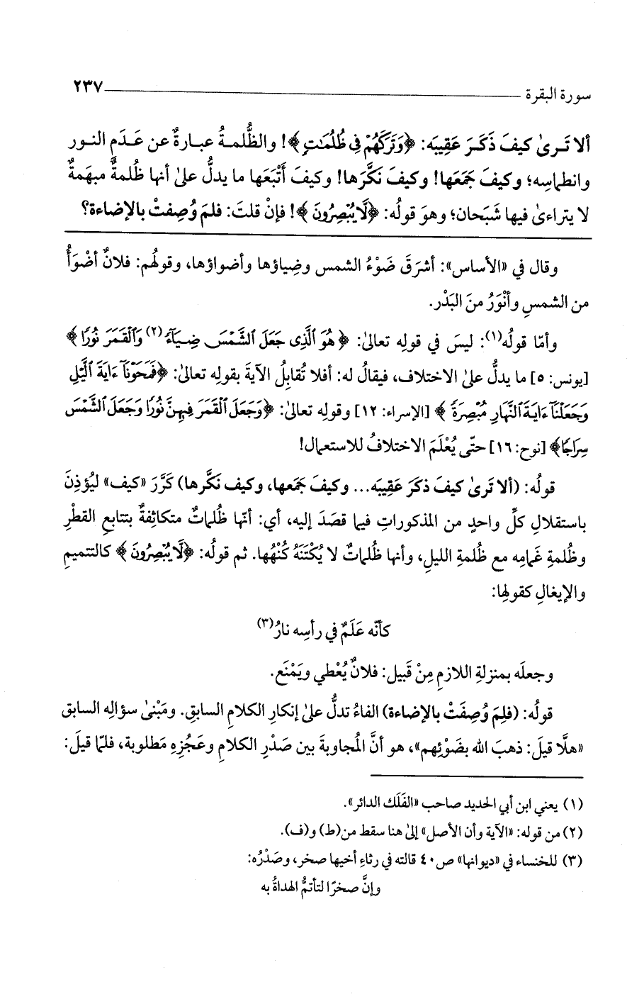 ألا ترى كيف ذكر عقيبه (وَتَرَكَهُمْ فِي ظُلُماتٍ)! والظلمة عبارة عن عدم النور وانطماسه، وكيف جمعها، وكيف نكرها، وكيف أتبعها ما يدل على أنها ظلمة مبهمة لا يتراءى فيها شبحان وهو قوله (لا يُبْصِرُونَ). فان قلت: فلم وصفت بالإضاءة؟