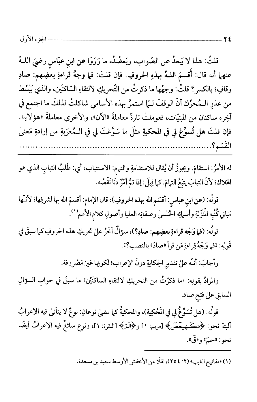 قلت: هذا لا يبعد عن الصواب، ويعضده ما رووا عن ابن عباس رضى اللَّه عنه أنه قال: أقسم اللَّه بهذه الحروف. فإن قلت: فما وجه قراءة بعضهم ص وق بالكسر؟ قلت: وجهها ما ذكرت من التحريك لالتقاء الساكنين، والذي يبسط من عذر المحرّك: أن الوقف لما استمرّ بهذه الأسامى، شاكلت لذلك ما اجتمع في آخره ساكنان من المبنيات، فعوملت تارة معاملة «الآن» وأخرى معاملة «هؤلاء». فإن قلت: هل تسوّغ لي في المحكية مثل ما سوّغت لي في المعربة من إرادة معنى القسم؟