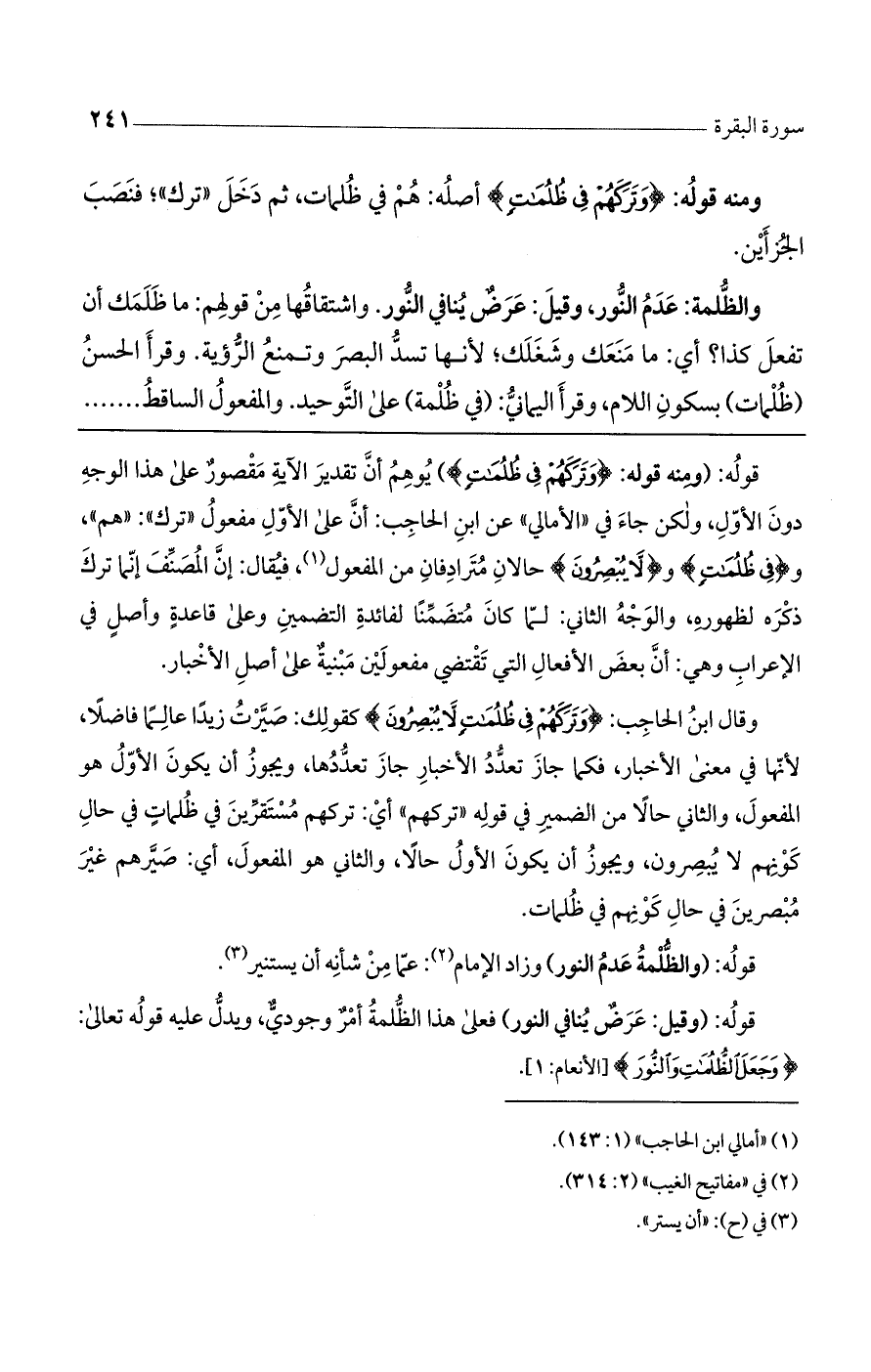 وقال ابن الحاجب: (وَتَرَكَهُمْ فِي ظُلُمَاتٍ لاَّ يُبْصِرُونَ) كقولك: صيرت زيدًا عالمًا فاضلاً، لأنها في معنى الأخبار، فكما جاز تعدد الأخبار جاز تعددها، ويجوز أن يكون الأول هو المفعول، والثاني حالاً من الضمير في قوله "تركهم" أي: تركهم مستقرين في ظلماتٍ في حال كونهم لا يبصرون، ويجوز أن يكون الأول حالاً، والثاني هو المفعول، أي: صيرهم غير مبصرين في حال كونهم في ظلمات.