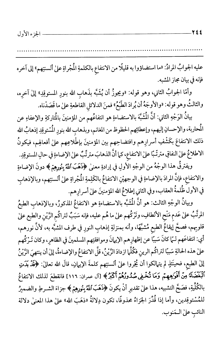 عليه الجواب المراد: "ما استضاؤوا به قليلاً من الانتفاع بالكلمة المجراة على ألسنتهم" إلى آخره فإنه في بيان مجاز المشبه.