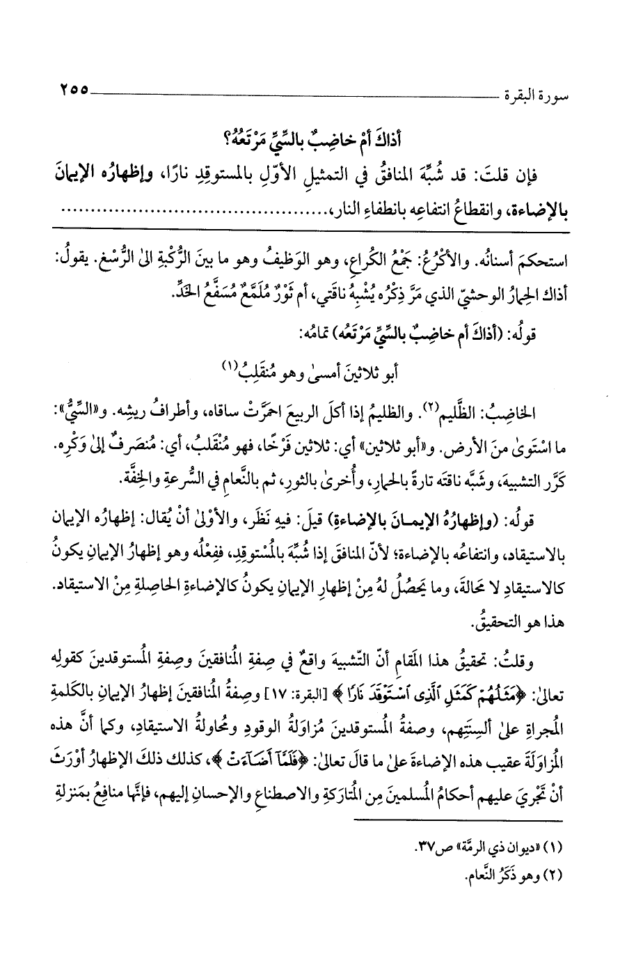 وقلت: تحقيق هذا المقام أن التشبيه واقع في صفة المنافقين وصفة المستوقدين كقوله تعالى: (مَثَلُهُمْ كَمَثَلِ الَّذِي اسْتَوْقَدَ نَارًا) [البقرة: 17] وصفة المنافقين إظهار الإيمان بالكلمة المجراة على ألسنتهم، وصفة المستوقدين مزاولة الوقود ومحاولة الاستيقاد، وكما أن هذه المزاولة عقيب هذه الإضاءة على ما قال تعالى: (فَلَمَّا أَضَاءَتْ)، كذلك ذلك الإظهار أورث أن تجري عليهم أحكام المسلمين من المتاركة والاصطناع والإحسان إليهم، فإنها منافع بمنزلة