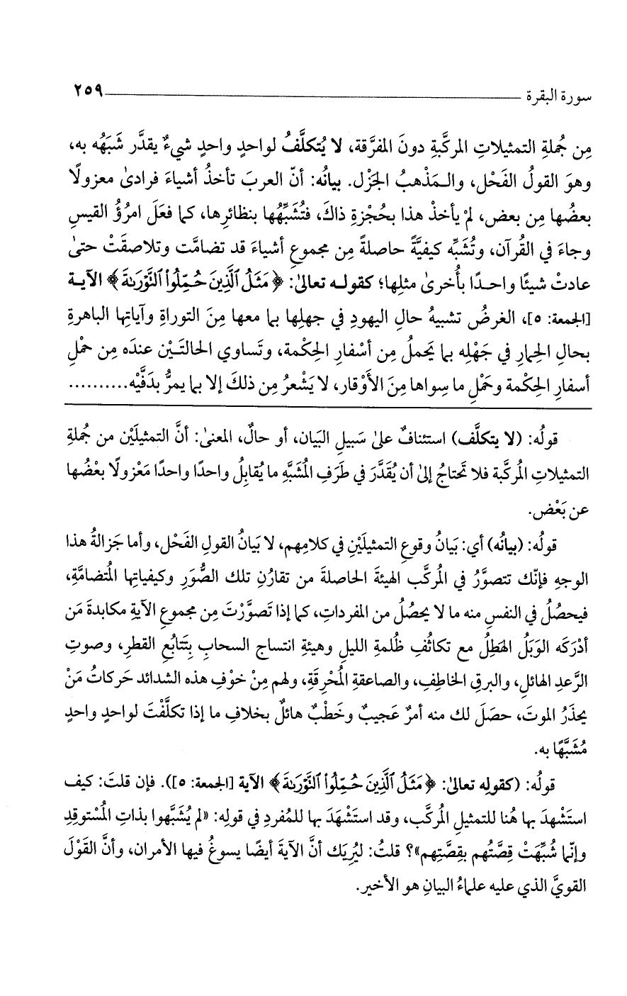 من جملة التمثيلات المركبة دون المفرّقة، لا يتكلف الواحد واحد شيء يقدر شبهه به، وهو القول الفحل والمذهب الجزل، بيانه: أنّ العرب تأخذ أشياء فرادى، معزولاً بعضها من بعض، لم يأخذ هذا بحجزة ذاك فتشبهها بنظائرها، كما فعل امرؤ القيس وجاء في القرآن، وتشبه كيفية حاصلة من مجموع أشياء قد تضامّت وتلاصقت حتى عادت شيئا واحدا، بأخرى مثلها كقوله تعالى: (مَثَلُ الَّذِينَ حُمِّلُوا التَّوْراةَ) الآية [الجمعة: 5]. الغرض تشبيه حال اليهود في جهلها بما معها من التوراة وآياتها الباهرة، بحال الحمار في جهله بما يحمل من أسفار الحكمة، وتساوى الحالتين عنده من حمل أسفار الحكمة وحمل ما سواها من الأوقار، لا يشعر من ذلك إلا بما يمرّ بدفيه