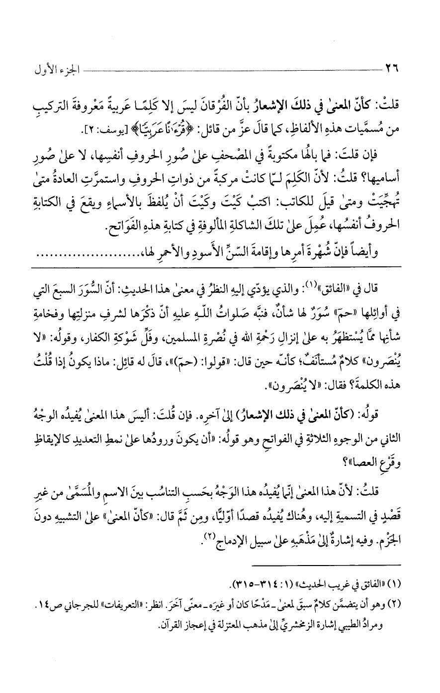فإن قلت: فما بالها مكتوبة في المصحف على صور الحروف أنفسها، لا على صور أساميها؟ قلت: لأنّ الكلم لما كانت مركبة من ذوات الحروف، واستمرّت العادة متى تهجيت ومتى قيل للكاتب: اكتب كيت وكيت أن يلفظ بالأسماء وتقع في الكتابة الحروف أنفسها، عمل على تلك الشاكلة المألوفة في كتابة هذه الفواتح.