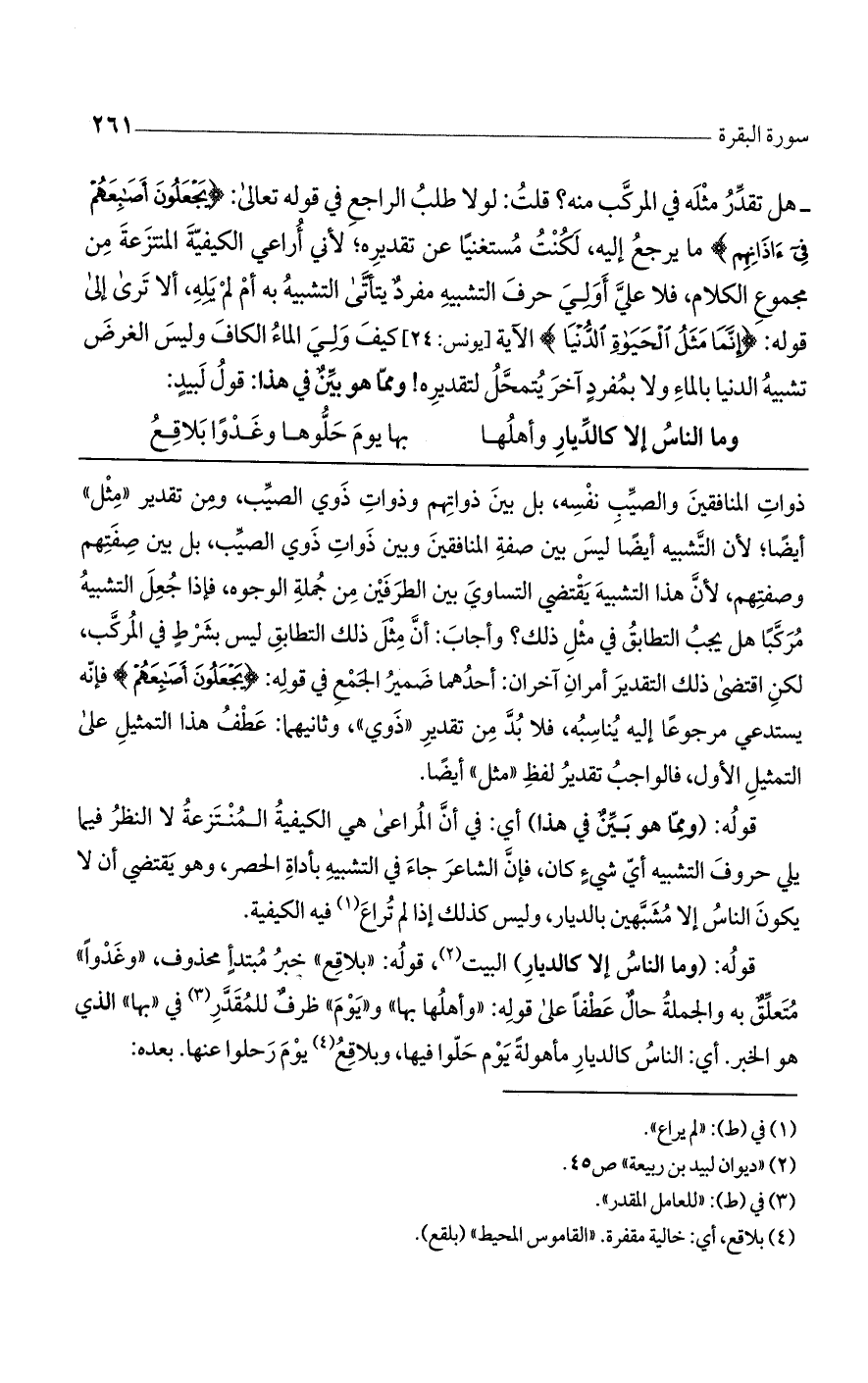 هل تقدّر مثله في المركب منه؟ قلت: لولا طلب الراجع في قوله تعالى: (يَجْعَلُونَ أَصابِعَهُمْ فِي آذانِهِمْ) ما يرجع إليه لكنت مستغنيا عن تقديره لأنى أراعى الكيفية المنتزعة من مجموع الكلام فلا علىّ أوَلِىَ حرف التشبيه مفرد يتأتى التشبيه به أم لم يله. ألا ترى إلى قوله: (إِنَّما مَثَلُ الْحَياةِ الدُّنْيا) الآية، كيف ولى الماء الكاف، وليس الغرض تشبيه الدنيا بالماء ولا بمفرد آخر يتمحل لتقديره. ومما هو بين في هذا قول لبيد:
