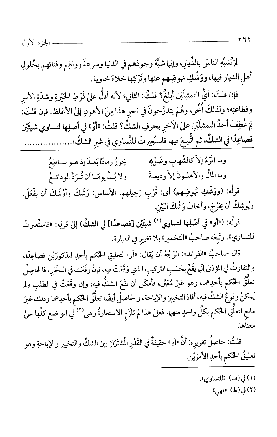 قوله: ("أو" في أصلها لتساوي شيئين [فصاعدًا] في الشك) إلى قوله: "فاستعيرت للتساوي". وتبعه صاحب "التخمير" بلا تغييرٍ في العبارة.