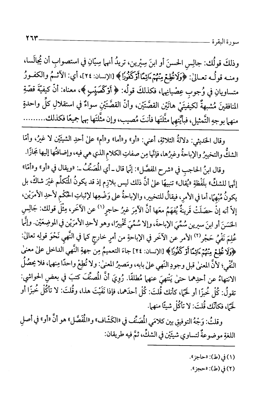 وقال ابن الحاجب في "شرح المفصل": إنما قال -أي المصنف-: "ويقال في "أو" و"أما" إنهما للشك" بلفظة "يقال" تنبيهًا على أن ذلك ليس بلازم إذ قد يكون المتكلم غير شاك، بل يكون مبهمًا، أما في الأمر، فيقال للتخيير، والإباحة على وضعها لإثبات الحكم لأحد الأمرين، إلا أنه إن حصلت قرينة يفهم معها أن الأمر غير حاجرٍ عن الآخر، مثل قولك: جالس الحسن أو ابن سيرين سمي الإباحة، وإلا سمي تخييرًا، وهو لأحد الأمرين في الموضعين. وإنما علم نفي حجر الأمر عن الآخر في الإباحة من أمرٍ خارجًٍ كما في النهي نحو قوله تعالى: (وَلَا تُطِعْ مِنْهُمْ آَثِمًا أَوْ كَفُورًا) [الإنسان: 24] جاء التعميم من جهة النهي الداخل على معنى النفي؛ لأن المعنى قبل وجود النهي على بابه، ومصير المعنى: ولا تطع واحدًا منهما، فلا يحصل الانتهاء عن أحدهما حتى ينتهي عنهما مطلقًا. روي أن المصنف كتب في بعض الحواشي: تقول: كل خبزًا أو لحمًا، كأنك قلت: كل أحدهما، فإذا نفيت هذا، وقلت: لا تأكل خبزًا أو لحمًا، فكأنك قلت: لا تأكل شيئًا منهما.