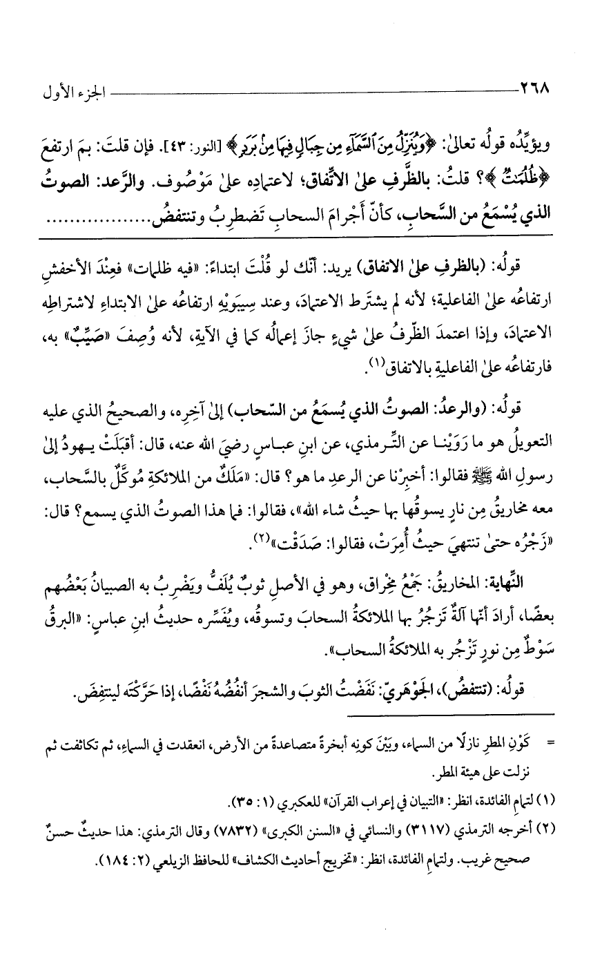 ويؤيده قوله تعالى: (وَيُنَزِّلُ مِنَ السَّماءِ مِنْ جِبالٍ فِيها مِنْ بَرَدٍ) [النور: 43]. فان قلت: بم ارتفع (ظلمات)؟ قلت: بالظرف على الاتفاق لاعتماده على موصوف. والرعد: الصوت الذي يسمع من السحاب، كأن أجرام السحاب تضطرب وتنتفض