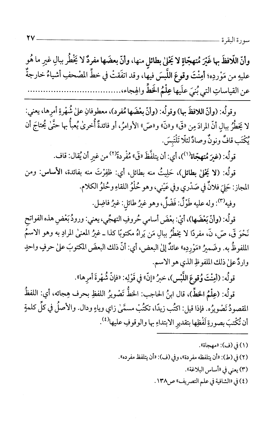 وأنّ اللافظ بها غير متهجاة لا يحلى بطائل منها، وأنّ بعضها مفرد لا يخطر ببال غير ما هو عليه من مورده؛ أمنت وقوع اللبس فيها، وقد اتفقت في خط المصحف أشياء خارجة عن القياسات التي بنى عليها علم الخط والهجاء،