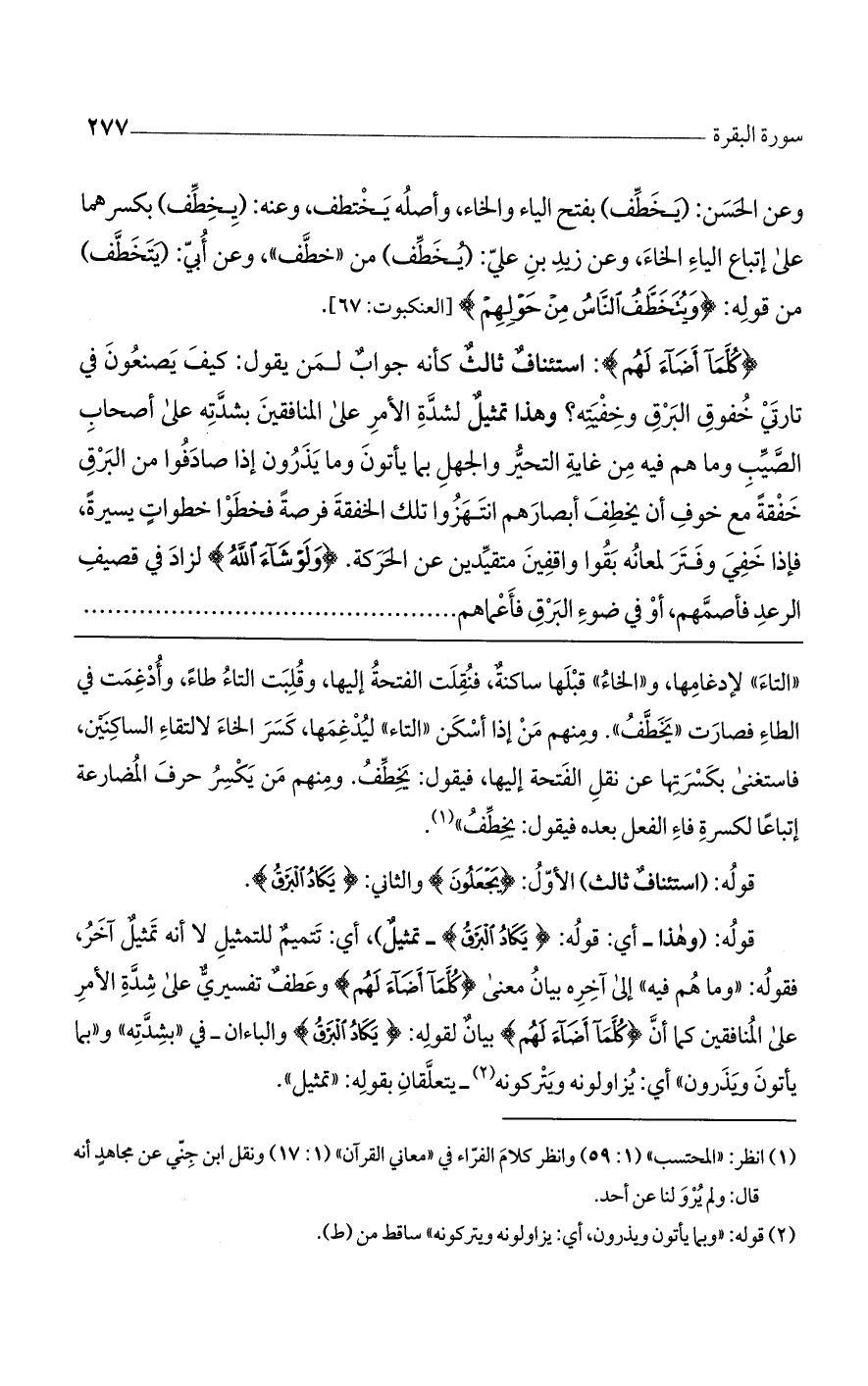 (كُلَّما أَضاءَ لَهُمْ) استئناف ثالث كأنه جواب لمن يقول: كيف يصنعون في تارتى خفوق البرق وخفيته؟ وهذا تمثيل لشدة الأمر على المنافقين بشدته على أصحاب الصيب وما هم فيه من غاية التحير والجهل بما يأتون وما يذرون، إذا صادفوا من البرق خفقة، مع خوف أن يخطف أبصارهم، انتهزوا تلك الخفقة فرصة فخطوا خطوات يسيرة، فإذا خفى وفتر لمعانه بقوا واقفين متقيدين عن الحركة، (ولو شاء اللَّه) لزاد في قصيف الرعد فأصمهم، أو في ضوء البرق فأعماهم