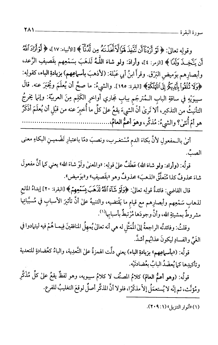 وقوله تعالى: (لَوْ أَرَدْنَا أَن نَتَخِذَ لَهوًّا لاَتَخذْنَاهُ مِن لَدُنَا) [الأنبياء: 17]، (لَوْ أَرادَ اللَّهُ أَنْ يَتَّخِذَ وَلَداً) [الزمر: 4]، وأراد: ولو شاء اللَّه لذهب بسمعهم بقصيف الرعد، وأبصارهم بوميض البرق. وقرأ ابن أبى عبلة: (لأذهب بأسماعهم)، بزيادة الباء كقوله: (وَلا تُلْقُوا بِأَيْدِيكُمْ إِلَى اَلتَهلُكَةِ) [البقرة: 195]. والشيء: ما صح أن يعلم ويخبر عنه. قال سيبويه - في ساقة الباب المترجم بباب مجارى أواخر الكلم من العربية -: وإنما يخرج التأنيث من التذكير. ألا ترى أن الشيء يقع على كل ما أخبر عنه من قبل أن يعلم أذكر هو أم أنثى؟ . والشيء: مذكر، وهو أعم العام،
