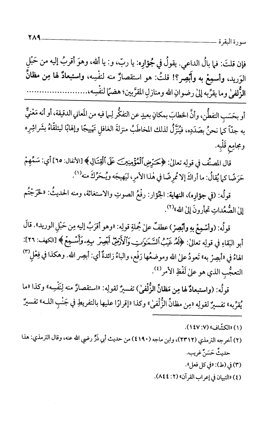 فإن قلت: فما بال الداعي يقول في جؤاره: يا رب، ويا اللَّه، وهو أقرب إليه من حبل الوريد، وأسمع به وأبصر؟ قلت: هو استقصار منه لنفسه، واستبعاد لها من مظانّ الزلفى وما يقرّبه إلى رضوان اللَّه ومنازل المقرّبين، هضما لنفسه،