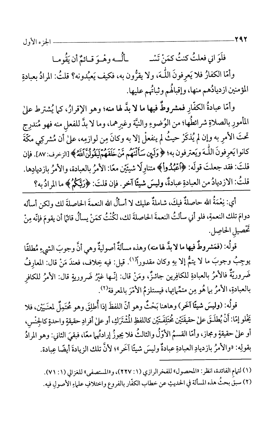قوله: (فمشروط فيها ما لا بد لها منه) وهذه مسألة أصولية وهي أن وجوب الشيء مطلقًا يوجب وجوب ما لا يتم إلا به وكان مقدورًا. قل: فيه خلاف، فعند من قال: المعارف ضرورية فالأمر بالعبادة للكافرين جائز، ومن قال: إنها غير ضروريةٍ قال: الأمر للكافر بالعبادة، الأمر بما هو من متمماتها، فيسلتزم الأمر بالمعرفة.