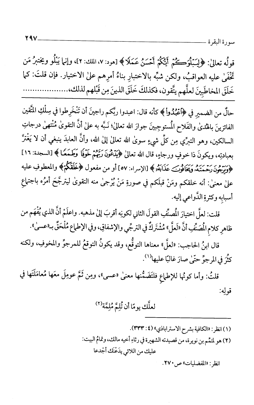 قوله تعالى: (لِيَبْلُوَكُمْ أَيُّكُمْ أَحْسَنُ عَمَلًا) [هود: 7، الملك: 2]، وإنما يبلو ويختبر من تخفى عليه العواقب، ولكن شبه بالاختبار بناء أمرهم على الاختيار. فإن قلت: كما خلق المخاطبين لعلهم يتقون، فكذلك خلق الذين من قبلهم لذلك،