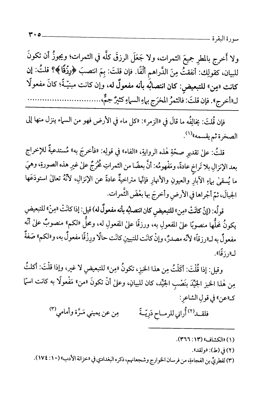 ولا أخرج بالمطر جميع الثمرات، ولا جعل الرزق كله في الثمرات. ويجوز أن تكون للبيان كقولك: أنفقت من الدراهم ألفا. فإن قلت: فيم انتصب (رِزْقاً)؟ قلت: إن كانت «من» للتبعيض. كان انتصابه بأنه مفعول له. وإن كانت مبنية، كان مفعولاً لـ"أخرج". فإن قلت: فالثمر المخرج بماء السماء كثير جمّ .........