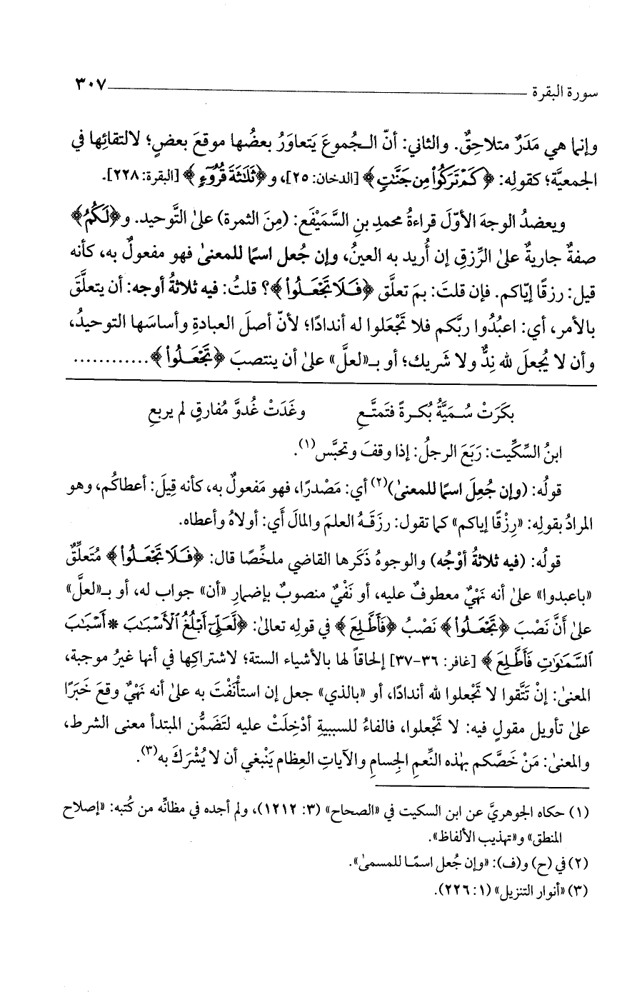 قلت: فيه ثلاثة أوجه: أن يتعلق بالأمر. أى اعبدوا ربكم فلا تجعلوا له أَنْداداً لأنّ أصل العبادة وأساسها التوحيد، وأن لا يجعل للَّه ندّ ولا شريك. أو بلعل، على أن ينتصب (تجعلوا) .....