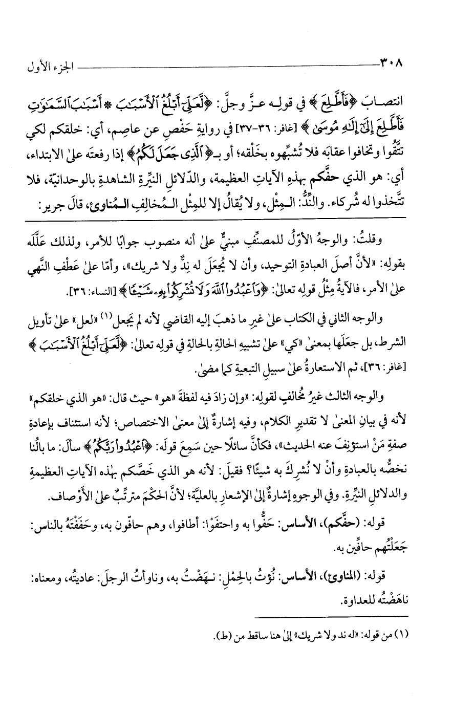 انتصاب، (فأطلع) في قوله عز وجل: (لَعَلِّي أَبْلُغُ الْأَسْبابَ* أَسْبابَ السَّماواتِ فَأَطَّلِعَ إِلى إِلهِ مُوسى) [غافر: 36 - 37] في رواية حفص عن عاصم، أى خلقكم لكي تتقوا وتخافوا عقابه فلا تشبهوه بخلقه، أو بالذي جعل لكم، إذا رفعته على الابتداء، أى هو الذي خصكم بهذه الآيات العظيمة والدلائل النيرة الشاهدة بالوحدانية، فلا تتخذوا له شركاء. والند: المثل. ولا يقال إلا للمثل المخالف المناوئ. قال جرير: