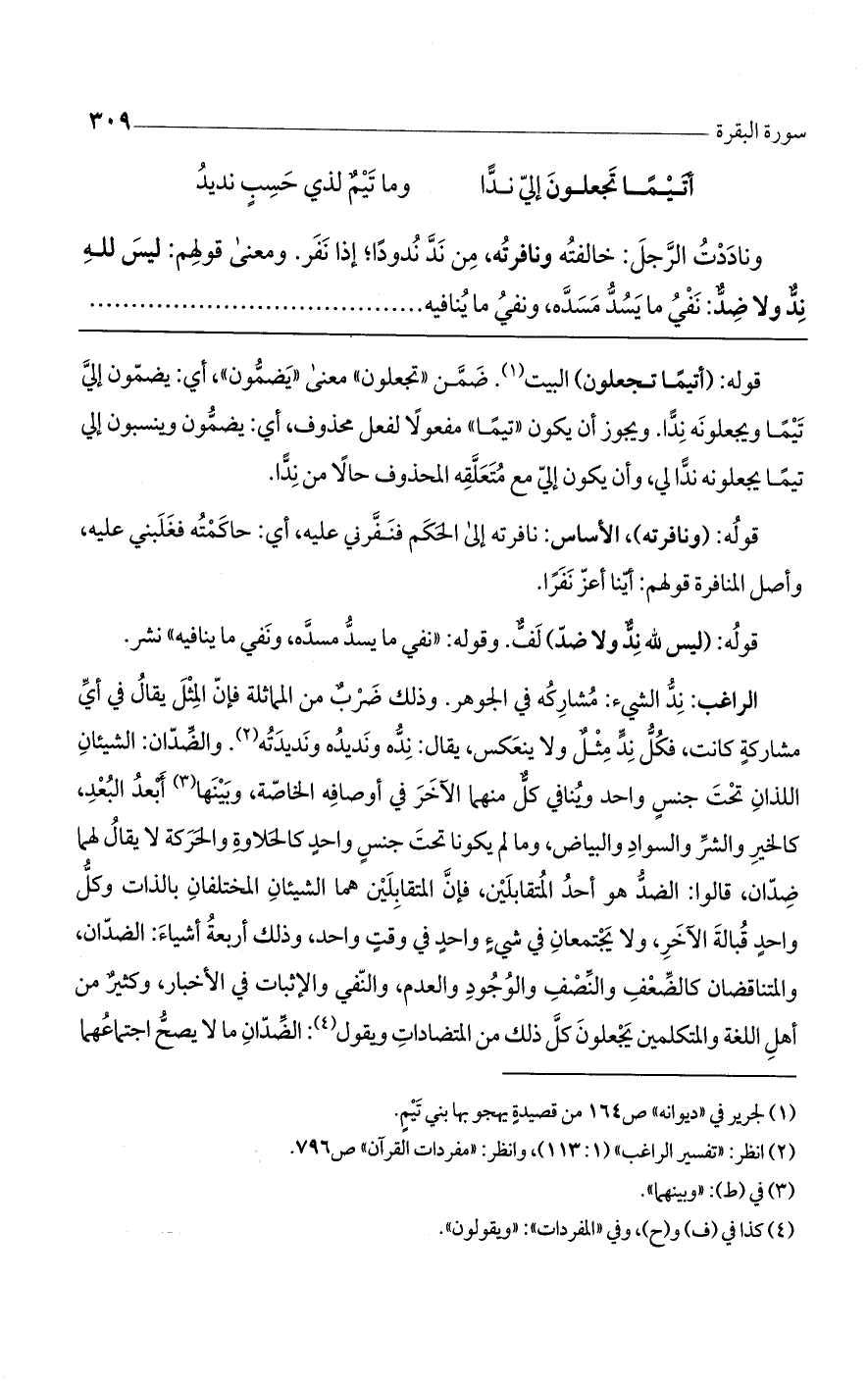الراغب: ند الشيء: مشاركه في الجوهر. وذلك ضرب من المماثلة فإن المثل يقال في أي مشاركة كانت، فكل ند مثل ولا ينعكس، يقال: نده ونديده ونديدته. والضدان: الشيئان اللذان تحت جنس واحد وينافي كل منهما الآخر في أوصافه الخاصة، وبينها أبعد البعد، كالخير والشر والسواد والبياض، وما لم يكونا تحت جنس واحد كالحلاوة والحركة لا يقال لهما ضدان، قالوا: الضد هو أحد المتقابلين، فإن المتقابلين هما الشيئان المختلفان بالذات وكل واحد قبالة الآخر، ولا يجتمعان في شيء واحد في وقت واحد وذلك أربعة أشياء: الضدان، والمتناقضان كالضعف والنصف والوجود والعدم، والنفي والإثبات في الأخبار، وكثير من أهل اللغة والمتكلمين يجعلون كل ذلك من المتضادات ويقول: الضدان ما لا يصح اجتماعهما
