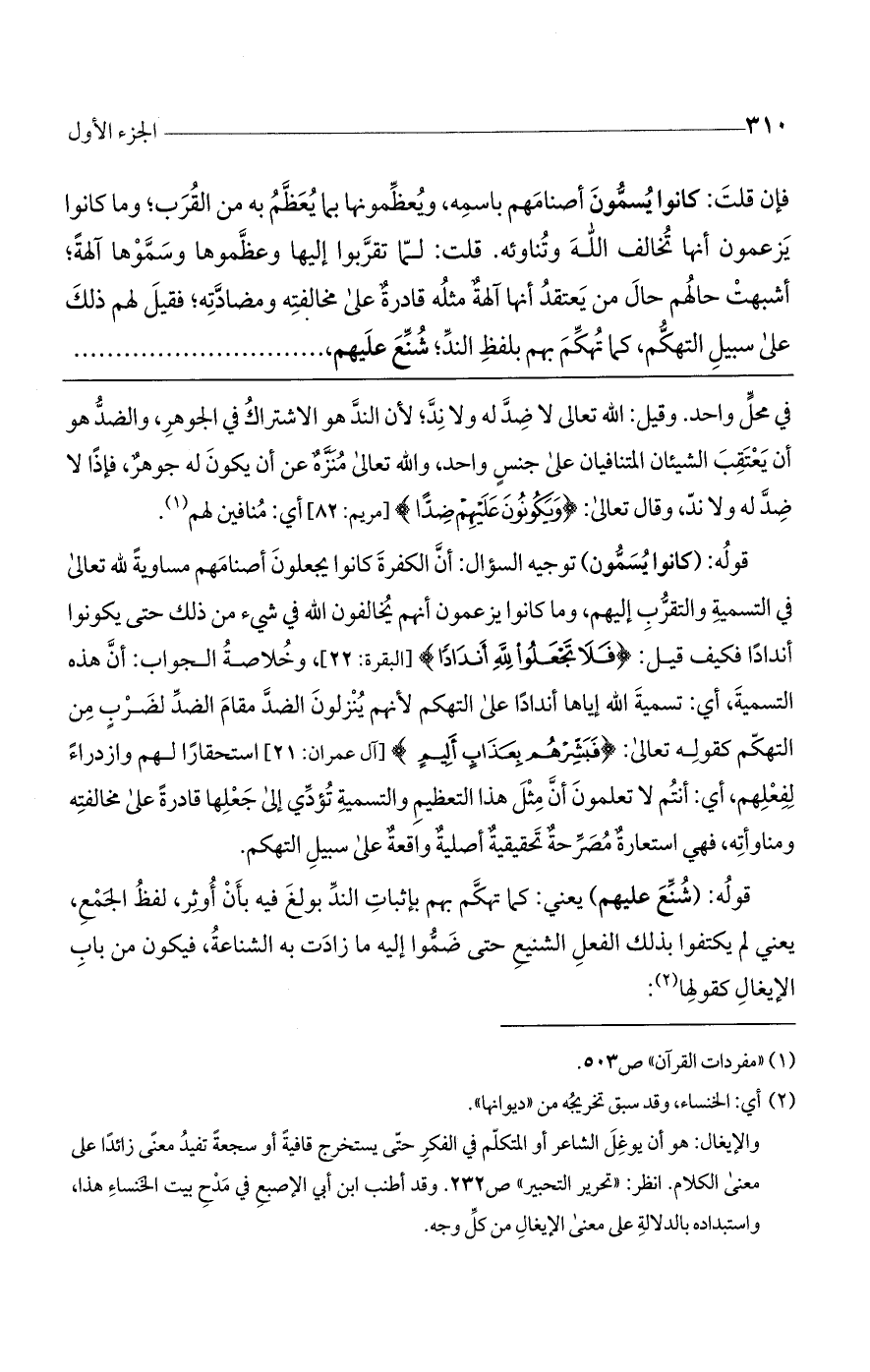 قوله: (كانوا يسمون) توجيه السؤال: أن الكفرة كانوا يجعلون أصنامهم مساوية لله تعالى في التسميه والتقرب إليهم، وما كانوا يزعمون أنهم يخالفون الله في شيء من ذلك حتى يكونوا أندادا فكيف قيل: (فَلَا تَجْعَلُوا لِلَّهِ أَنْدَادًا)] البقرة: 22 [، وخلاصة الجواب: أن هذه التسمية، أي: تسمية الله إياها أندادا على التهكم لأنهم ينزلون الضد مقام الضد لضرب من التهكم كقوله تعالى: (فَبَشِّرْهُمْ بِعَذَابٍ أَلِيمٍ)] آل عمران: 21 [استحقارا لهم وازدراء لفعلهم، أي: أنتم لا تعلمون أن مثل هذا التعظيم والتسمية تؤدى إلى جعلها قادرة على مخالفته ومناوأته، فهي استعارة مصرحة تحقيقية أصلية واقعة على سبيل التهكم.
