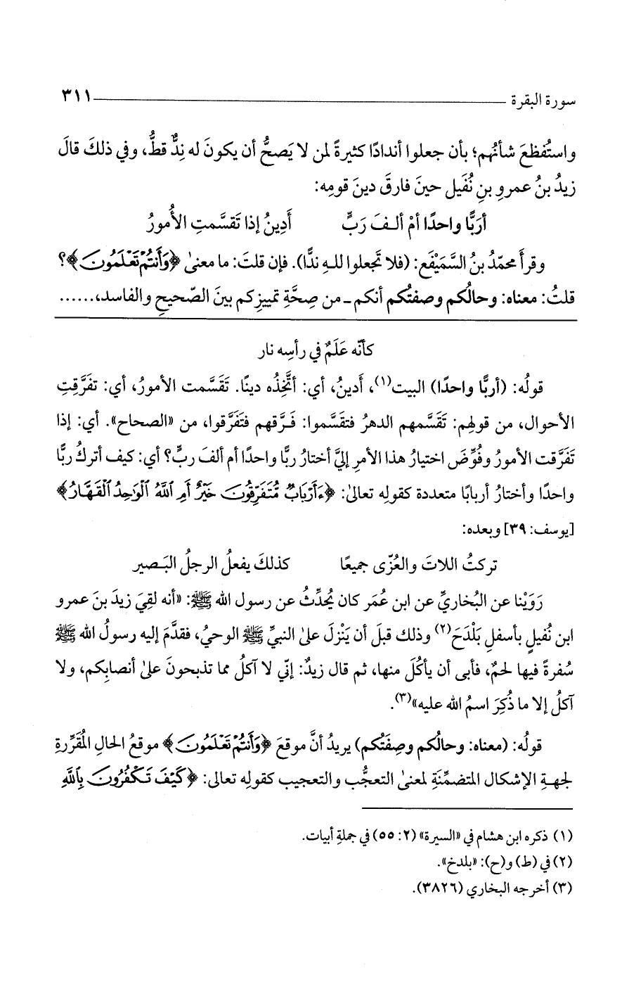 روينا عن البخاري عن ابن عمر كان يحدث عن رسول الله - صل الله عليه وسلم-: ((أنه لقى زيد بن عمرو ابن نفيل بأسفل بلدح وذلك قبل أن ينزل على النبي - صل الله عليه وسلم- الوحي، فقدم إليه رسول الله - صل الله عليه وسلم- سفرة فيها لحم، فأبى أن ياكل منها، ثم قال زيد: إنى لا آكل مما تذبحون على أنصابكم، ولا آكل إلا ما ذكر اسم الله عليه)).