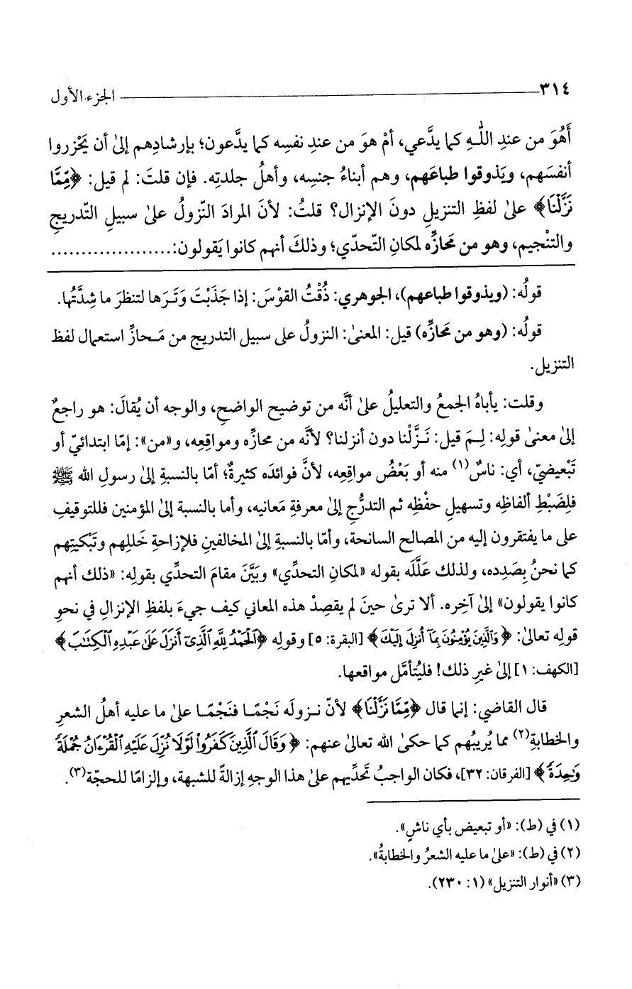 وقلت: يأباه الجمع والتعليل على أنه من توضيح الواضح، والوجه أن يقال: هو راجع إلى معنى قوله: لم قيل: نزلنا دون أنزلنا؟ لأنه من محازه ومواقعه، و ((من)): إما ابتدائي أو تبعيضي، أي: ناس منه أو بعض مواقعه، لأن فوائده كثيرة؛ أما بالنسبة إلى رسول الله? فلضبط ألفاظه وتسهيل حفظه ثم التدرج إلى معرفة معانيه، وأما بالنسبة إلى المؤمنين فللتوقيف على ما يفتقرون إليه من المصالح السانحة، وأما بالنسبة إلى المخالفين فلإزاحة خللهم وتبكيتهم كما نحن بصدده، ولذلك علله بقوله ((لمكان التحدي)) وبين مقام التحدي بقوله: ((ذلك أنهم كانوا يقولون)) إلى آخره. ألا ترى حين لم يقصد هذه المعاني كيف جيء بلفظ الإنزال في نحو قوله تعالى: (وَالَّذِينَ يُؤْمِنُونَ بِمَا أُنْزِلَ إِلَيْكَ)] البقرة: 4 [وقوله (الْحَمْدُ لِلَّهِ الَّذِي أَنْزَلَ عَلَى عَبْدِهِ الْكِتَابَ)] الكهف: 1 [إلى غير ذلك! فليتأمل مواقعها.