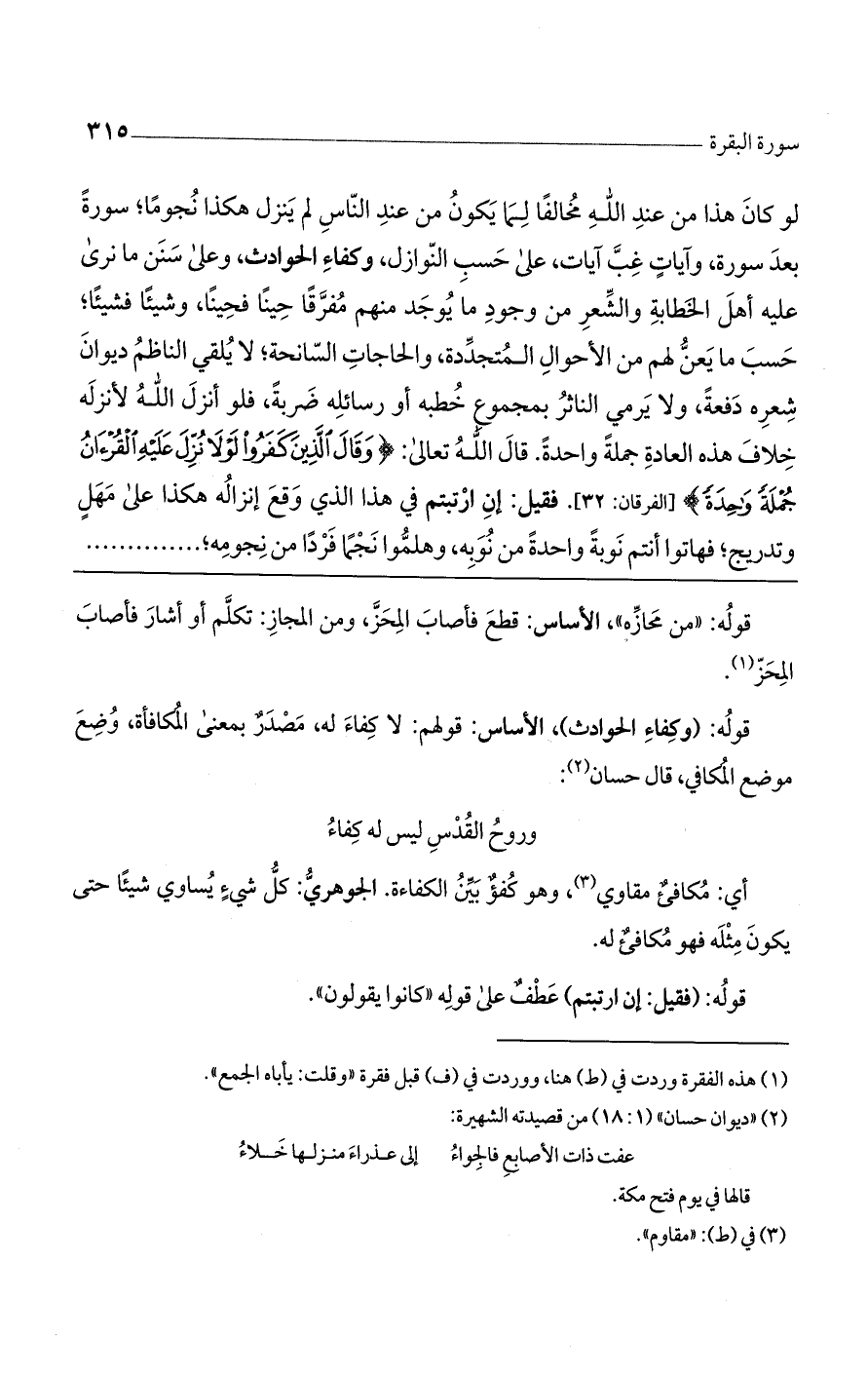 لو كان هذا من عند اللَّه مخالفاً لما يكون من عند الناس، لم ينزل هكذا نجوما سورة بعد سورة وآيات غب آيات، على حسب النوازل وكفاء الحوادث «2» وعلى سنن ما نرى عليه أهل الخطابة والشعر، من وجود ما يوجد منهم مفرقا حيناً فحيناً، وشيئاً فشيئا حسب ما يعنّ لهم من الأحوال المتجددة والحاجات السانحة، لا يلقى الناظم ديوان شعره دفعة، ولا يرمى النائر بمجموع خطبه أو رسائله ضربة، فلو أنزله اللَّه لأنزله خلاف هذه العادة جملة واحدة: قال اللَّه تعالى: (وَقالَ الَّذِينَ كَفَرُوا لَوْلا نُزِّلَ عَلَيْهِ الْقُرْآنُ جُمْلَةً واحِدَةً) [الفرقان: 32]. فقيل: إن ارتبتم في هذا الذي وقع إنزاله هكذا على مهل وتدريج، فهاتوا أنتم نوبة واحدة من نوبه، وهلموا نجماً فرداً من نجومه؛