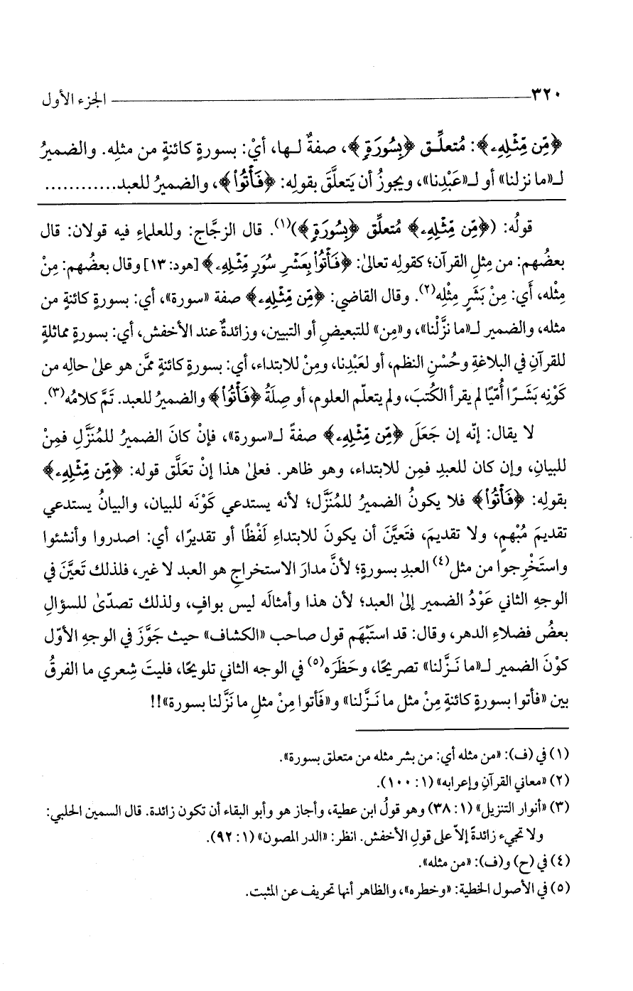 لا يقال: إنه إن جعل (مِنْ مِثْلِهِ) صفه لـ ((سورة))، فإن كان الضمير للمنزل فمن للبيان، وإن كان للعبد فمن للابتداء، وهو ظاهر. فعلى هذا إن تعلق قوله: (مِنْ مِثْلِهِ) بقوله: (فَاتُوا) فلا يكون الضمير للمنزل؛ لأنه يستدعى كونه للبيان، والبيان يستدعى تقديم مبهم، ولا تقديم، فتعين أن يكون للابتداء لفظاً أو تقديراً، أي: اصدروا وأنشئوا واستخرجوا من مثل العبد بسورةٍ؛ لأن مدار الاستخراج هو العبد لا غير، فلذلك تعين في الوجه الثاني عود الضمير إلى العبد؛ لأن هذا وأمثاله ليس بوافٍ، ولذلك تصدى للسؤال بعض فضلاء الدهر، وقال: قد استبهم قوله صاحب ((الكشاف)) حيث جوز في الوجه الأول كون الضمير لـ ((ما نزلنا)) تصريحا، وحظره في الوجه الثاني تلويحاً، فليت شعرى ما الفرق بين ((فأتوا بسورة كائنة من مثل ما نزلنا)) و ((فأتوا من مثل ما نزلنا بسورة))! !