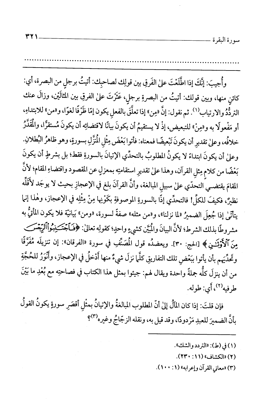وأجيب: إنك إذا اطلعت على الفرق بين قولك لصاحبك: أتيت برجل من البصرة، أي: كائن منها، وبين قولك: أتيت من البصرة برجل، عثرت على الفرق بين المثالين، وزال عنك التردد والارتياب. ثم نقول: إن ((من)) إذا تعلق بالفعل يكون إما ظرفا لغوا، و ((من)) للابتداء، أو مفعولا به و ((من)) للتبعيض، إذ لا يستقيم أن يكون بيانا لاقتضائه أن يكون مستقرا، والمقدر خلافه، وعلى تقدير أن يكون تبعيضا فمعناه: فأتوا بعض مثل المنزل بسورة، وهو ظاهر البطلان.