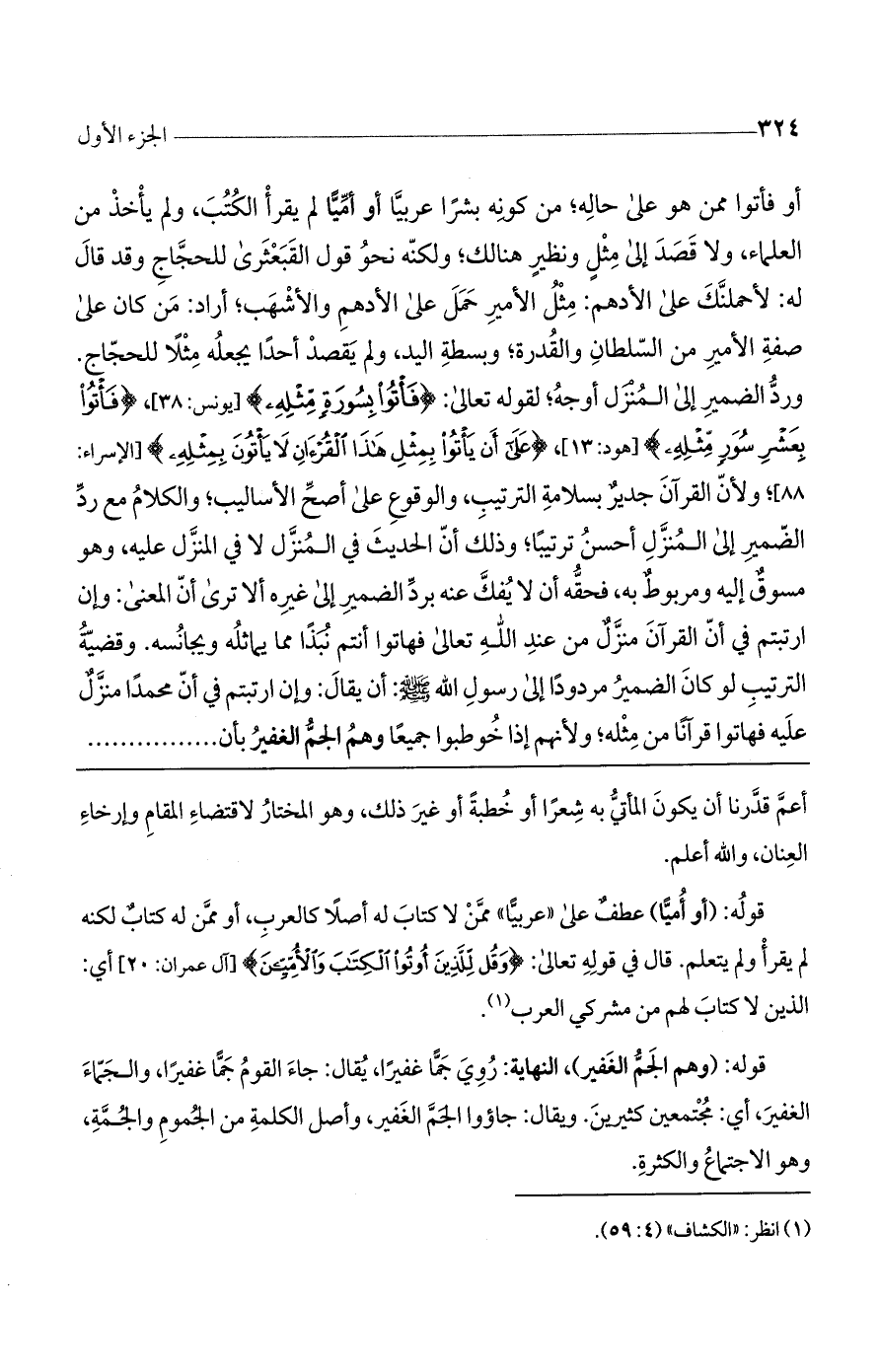 أو فأتوا ممن هو على حاله من كونه بشرا عربياً أو أمياً لم يقرأ الكتب ولم يأخذ من العلماء، ولا قصد إلى مثل ونظير هنالك. ولكنه نحو قول القبعثرى للحجاج - وقد قال له: لأحملنك على الأدهم -: مثل الأمير حمل على الأدهم والأشهب. أراد: من كان على صفة الأمير من السلطان والقدرة وبسطة اليد. ولم يقصد أحدا يجعله مثلا للحجاج. وردّ الضمير إلى المنزل أوجه، لقوله تعالى: (فَاتُوا بِسُورَةٍ مِنْ مِثْلِهِ) [يونس: 38]. (فَاتُوا بِعَشْرِ سُوَرٍ مِثْلِهِ) [هود: 13]، (عَلى أَنْ يَاتُوا بِمِثْلِ هذَا الْقُرْآنِ لا يَاتُونَ بِمِثْلِهِ) [الإسراء: 88]، ولأن القرآن جدير بسلامة الترتيب والوقوع على أصح الأساليب، والكلام مع ردّ الضمير إلى المنزل أحسن ترتيباً؛ وذلك أن الحديث في المنزل لا في المنزل عليه، وهو مسوق إليه ومربوط به، فحقه أن لا يفك عنه برد الضمير إلى غيره. ألا ترى أن المعنى: وإن ارتبتم في أنّ القرآن منزل من عند اللَّه. فهاتوا أنتم نبذاً مما يماثله ويجانسه. وقضية الترتيب لو كان الضمير مردوداً إلى رسول اللَّه صلى اللَّه عليه وسلم أن يقال: وإن ارتبتم في أنّ محمداً مُنزل عليه فهاتوا قرآنا من مثله. ولأنهم إذا خوطبوا جميعاً - وهم الجم الغفير بأن ........