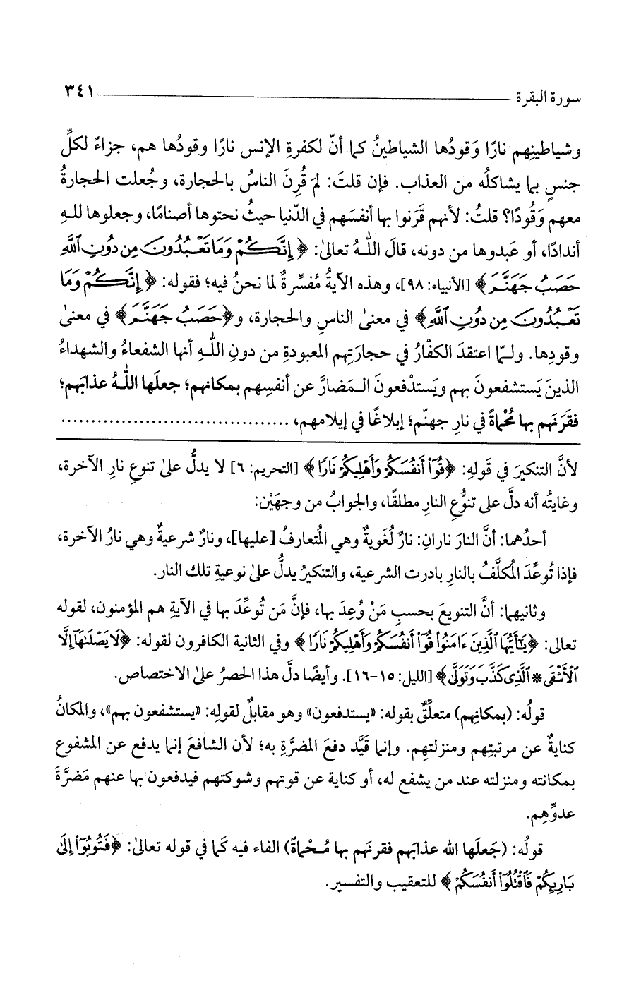 وشياطينهم ناراً وقودها الشياطين، كما أنّ لكفرة الإنس ناراً وقودها هم، جزاء لكل جنس بما يشاكله من العذاب. فإن قلت: لم قرن الناس بالحجارة وجعلت الحجارة معهم وقوداً. قلت: لأنهم قرنوا بها أنفسهم في الدنيا، حيث نحتوها أصناما وجعلوها للَّه أنداداً أو عبدوها من دونه: قال اللَّه تعالى: (إِنَّكُمْ وَما تَعْبُدُونَ مِنْ دُونِ اللَّهِ حَصَبُ جَهَنَّمَ) [الأنبياء: 98]، وهذه الآية مفسرة لما نحن فيه. فقوله: (إِنَّكُمْ وَما تَعْبُدُونَ مِنْ دُونِ اللَّهِ) في معنى الناس والحجارة، و (حَصَبُ جَهَنَّمَ) في معنى وقودها. ولما اعتقد الكفار في حجارتهم المعبودة من دون اللَّه أنها الشفعاء والشهداء الذين يستشفعون بهم ويستدفعون المضارّ عن أنفسهم بمكانهم، جعلها اللَّه عذابهم، فقرنهم بها محماة في نار جهنم، إبلاغا في إيلامهم، .......