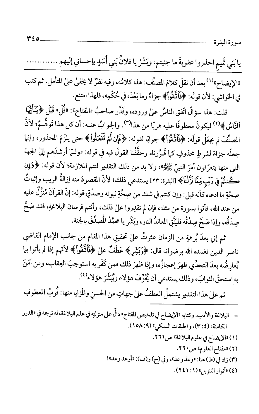 ثم إني بعد برهة من الزمان عثرت على تحقيق هذا المقام من جانب الإمام القاضي ناصر الدين تغمده الله برضوانه قال: " (وَبَشِّرِ) عطف على (فَاتَّقُوا) لأنهم إذا لم يأتوا بما يعارضه بعد التحدي ظهر إعجازه, وإذا ظهر ذلك فمن كفر به استوجب العقاب, ومن آمن به استحق الثواب, وذلك يستدعي أن يخوف هؤلاء ويبشر هؤلاء.