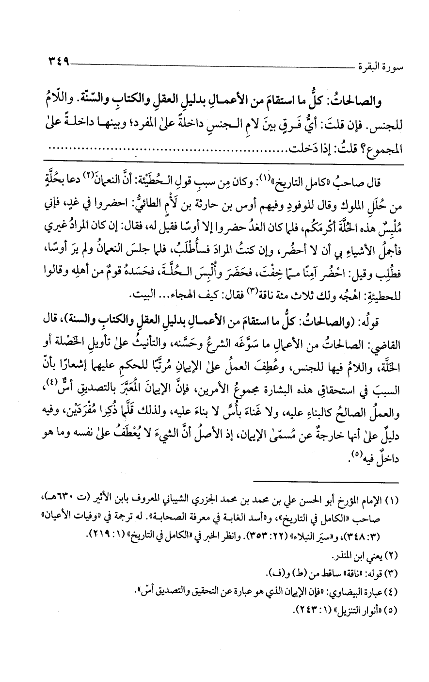 قوله: (والصالحات: كل ما استقام من العمال بجليل العقل والكتاب والسنة) , قال القاضي: الصالحات من الأعمال ما سوغه الشرع وحسنه, والتأنيث على تأويل الخصلة أو الخلة, واللام فيها للجنس, وعطف العمل على الإيمان مرتبا للحكم عليها إشعاراً بأن السبب في استحقاق هذه البشارة مجموع الأمرين, فإن الإيمان المعبر بالتصديق أسٌّ, والعمل الصالح كالبناء عليه, ولا غناء بأس لا بناء عليه, ولذلك قلما ذُكرا مفردين, وفيه دليلٌ على أنها خارجةٌ عن مسمى الإيمان, إذ الأصلُ ان الشئ لا يعطف على نفسه وما هو داخل فيه.