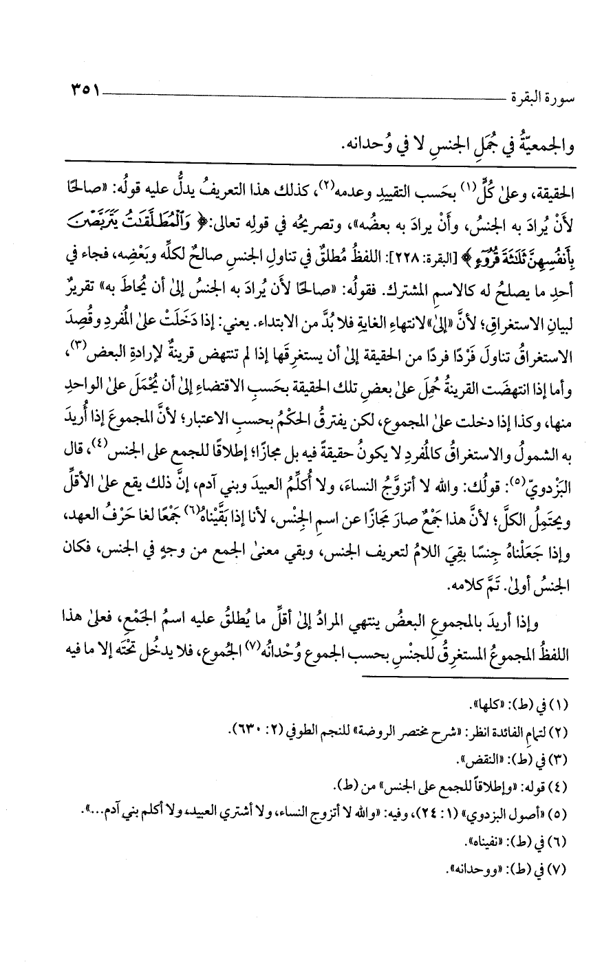 الحقيقة، وعلى كل بحسب التقييد وعدمه، كذلك هذا التعريف يدل عليه قوله: "صالحاً لأن يراد به الجنس، وأن يراد به بعضه"، وتصريحه في قوله: (وَالْمُطَلَّقَاتُ يَتَرَبَّصْنَ بِأَنْفُسِهِنَّ ثَلاثَةَ قُرُوءٍ) [البقرة: 228]: اللفظ مطلق في تناول الجنس صالح لكله وبعضه، فجاء في أحد ما يصلح له كالاسم المشترك. فقوله: "صالحاً لأن يراد به الجنس إلى أن يحاط به" تقرير لبيان الاستغراق؛ لأن "إلى" لانتهاء الغاية فلا بد من الابتداء. يعني: إذا دخلت على المفرد وقصد الاستغراق تناول َفرداً فرداً من الحقيقة إلى أن يستغرقها إذا لم تنتهض قرينةٌ لإرادة البعض، وأما إذا انتهضت القرينة حمل على بعض تلك الحقيقية بحسب الإقتضاء إلى أن يحمل على الواحد منها، وكذا إذا دخلت على المجموع، لكن يفترق الحكم بحسب الاعتبار؛ لأن المجموع إذا أريد به الشمول والاستغراق كالمفرد لا يكون حقيقة فيه بل مجازاً؛ إطلاقاً للجمع على الجنس، قال البزدوي: قولك: والله لا أتزوج النساء، ولا أكلم العبيد وبني آدم، إنَّ ذلك يقع على الأقل ويحتمل الكل؛ لأن هذا جمعٌ صار مجازاً عن اسم الجنس، وبقي معنى الجمع من وجهٍ في الجنس، فكان الجنس أولى. تم كلامه.