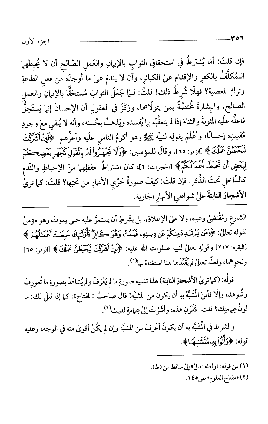 الشارع ومقتضى وعده، ولا على الإطلاق، بل بشرط أن يستمر عليه حتى يموت وهو مؤمن لقوله تعالى: (وَمَنْ يَرْتَدِدْ مِنْكُمْ عَنْ دِينِهِ فَيَمُتْ وَهُوَ كَافِرٌ فَأُولَئِكَ حَبِطَتْ أَعْمَالُهُمْ) [البقرة: 217] وقوله تعالى لنبيه صلوات الله عليه: (لَئِنْ أَشْرَكْتَ لَيَحْبَطَنَّ عَمَلُكَ) [الزمر: 65] ونحوهما، ولعله تعالى لم يقيدها هنا استغناءً بها.