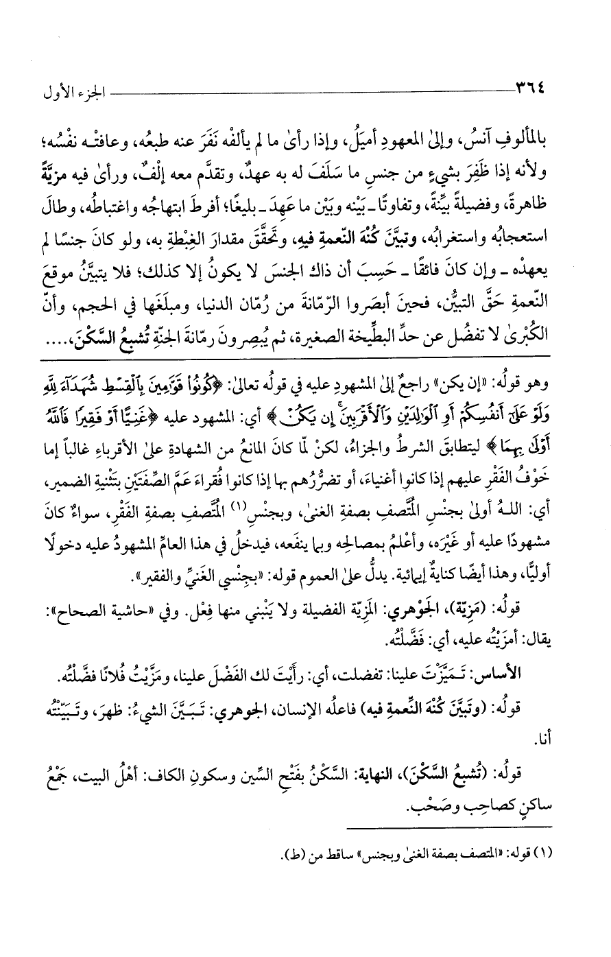 وهو قوله: "إن يكن" راجع إلى المشهود عليه في قوله تعالى: (كُونُوا قَوَّامِينَ بِالْقِسْطِ شُهَدَاءَ لِلَّهِ وَلَوْ عَلَى أَنْفُسِكُمْ أَوِ الْوَالِدَيْنِ وَالْأَقْرَبِينَ إِنْ يَكُنْ) أى: المشهود عليه (غَنِيًّا أَوْ فَقِيرًا فَاللَّهُ أَوْلَى بِهِمَا) ليتطابق الشرط والجزاء، لكن لما كان المانع من الشهادة على الأقرباء غالباً إما خوف الفقر عليهم إذا كانوا أغنياء، أو تضررهم بها إذا كانوا فقراء عم الصفتين بتثنية الضمير، أي: الله أولى بجنس المتصف بصفة الغني، وبجنس المتصف بصفة الفقر، سواء كان مشهوداً عليه أو غيره، وأعلم بمصالحه وبما ينفعه، فيدخل في هذا العالم المشهود عليه دخولاً أولياً، وهذا أيضاً كناية إيمائية. يدل على العموم قوله: "بجنسي الغني والفقير".