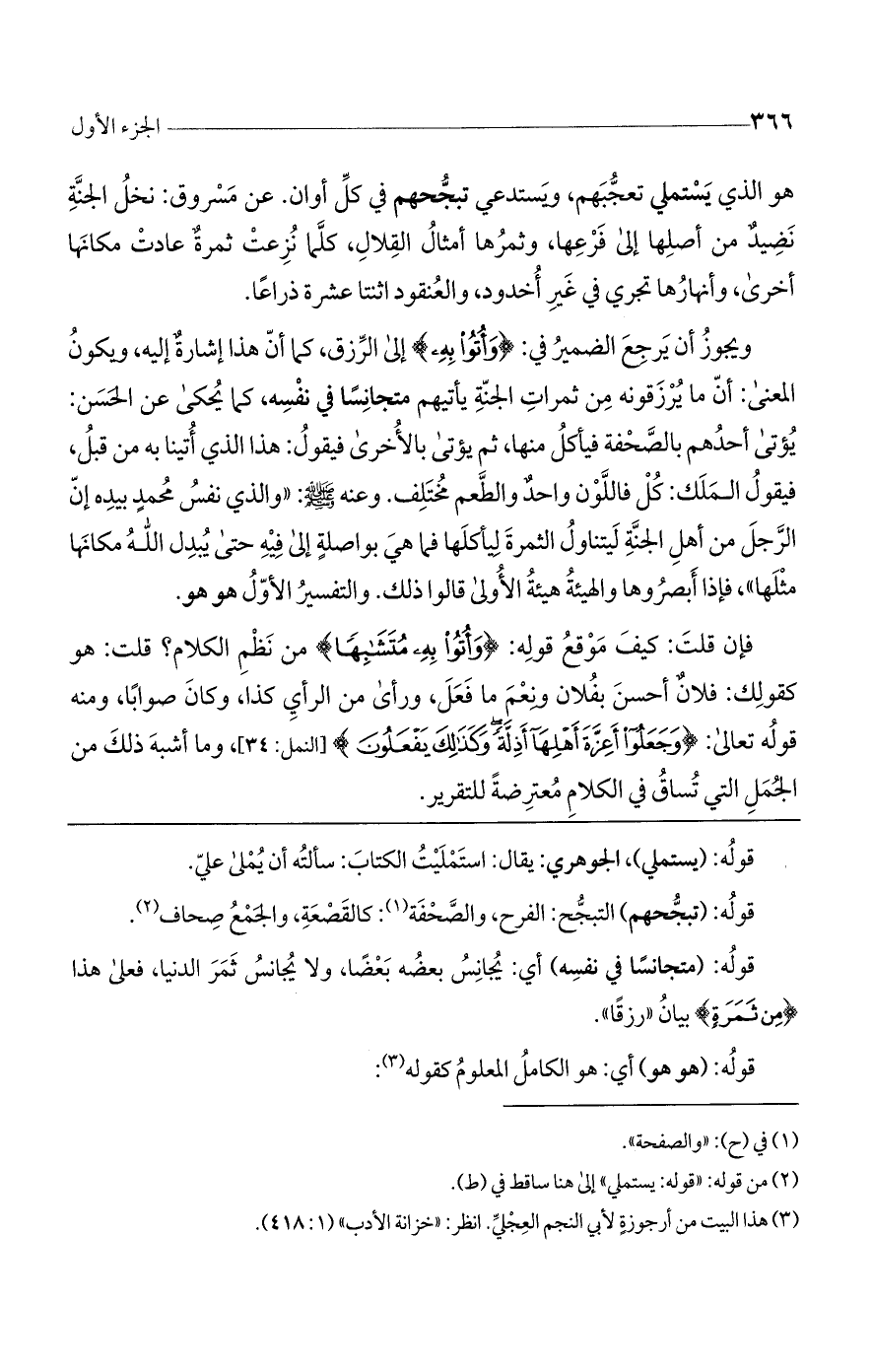 فإن قلت: كيف موقع قوله: (وَأُتُوا بِهِ مُتَشابِهاً) من نظم الكلام؟ قلت: هو كقولك: فلان أحسن بفلان ونعم ما فعل. ورأى من الرأى كذا وكان صوابا. ومنه قوله تعالى: (وَجَعَلُوا أَعِزَّةَ أَهْلِها أَذِلَّةً وَكَذلِكَ يَفْعَلُونَ) [النمل: 34]، وما أشبه ذلك من الجمل التي تساق في الكلام معترضة للتقرير.