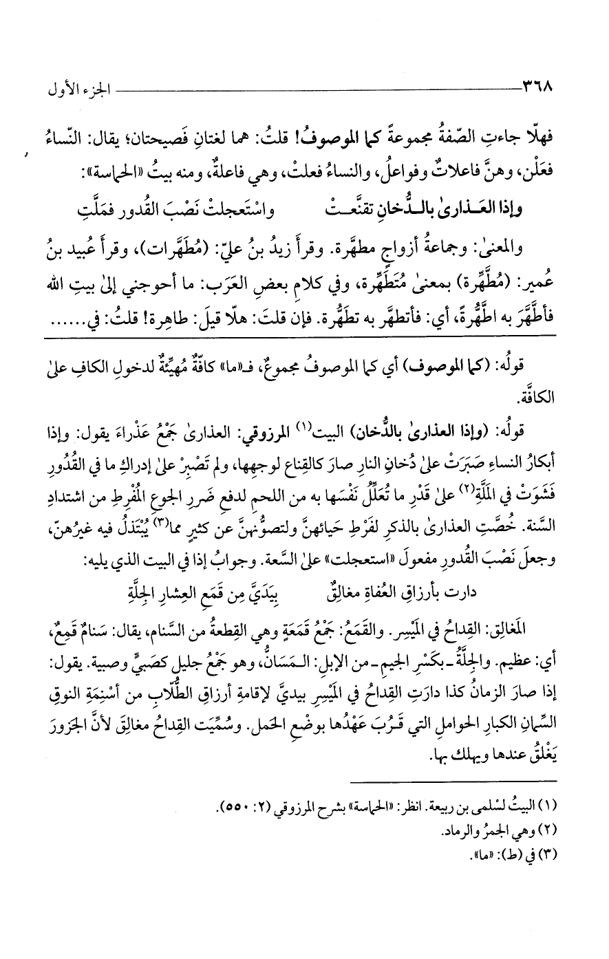 قوله: (وإذا العذارى بالدخان) البيت المرزوقي: العذارى جمع عذراء يقول: وإذا أبكار النساء صبرت على دخان النار صار كالقناع لوجهها، ولم تصبر على إدراك ما في القدور فشوت في الملة على قدر ما تعلل نفسها به من اللحم لدفع ضرر الجوع المفرط من اشتداد السنة. خصت العذارى بالذكر لفرط حيائهن ولتصونهن عن كثير مما يبتذل فيه غيرهن، وجعل نصب القدور مفعول "استعجلت"على السعة. وجواب إذا في البيت الذي يليه: