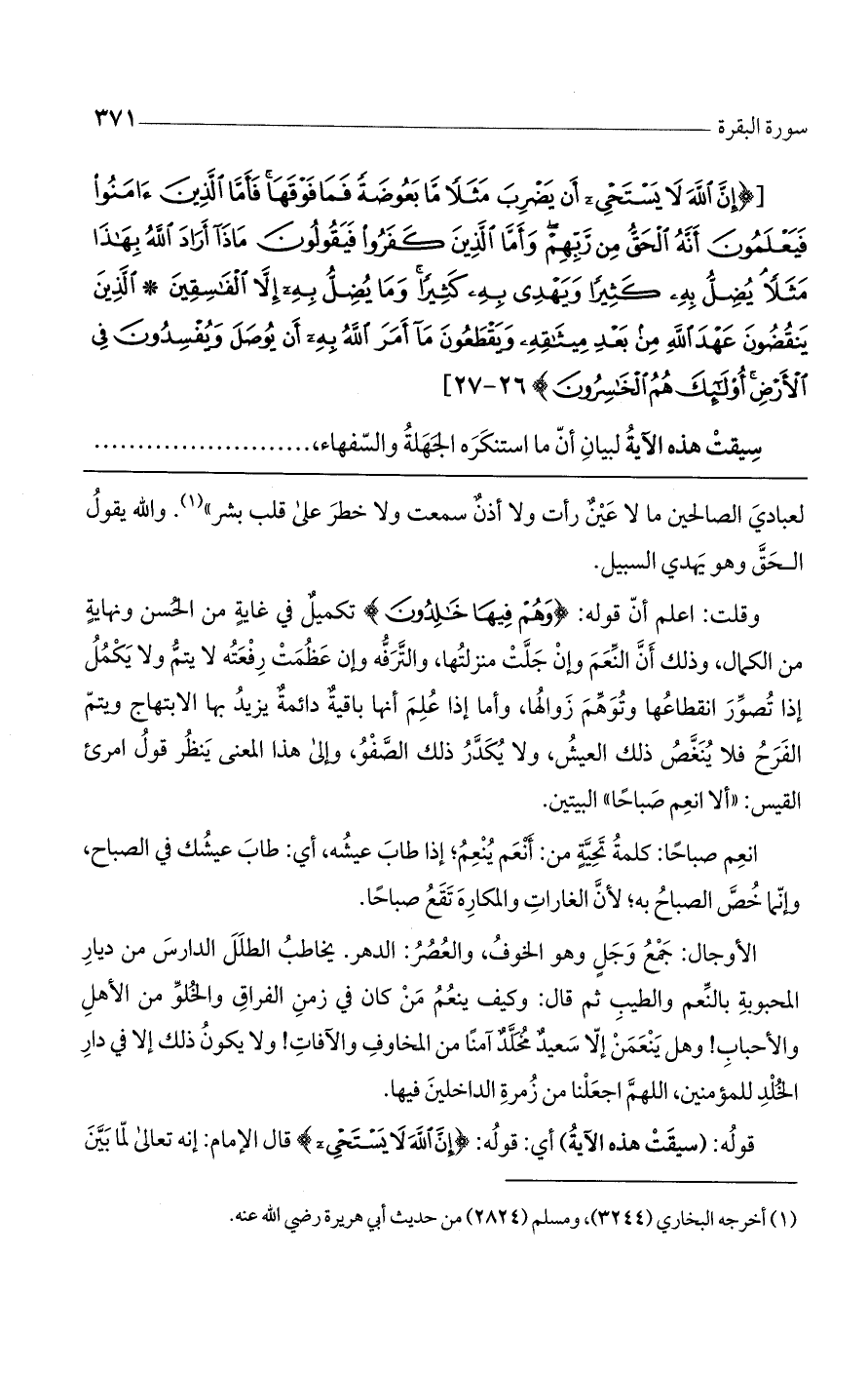 [(إِنَّ اللَّهَ لا يَسْتَحْيِي أَنْ يَضْرِبَ مَثَلاً ما بَعُوضَةً فَما فَوْقَها فَأَمَّا الَّذِينَ آمَنُوا فَيَعْلَمُونَ أَنَّهُ الْحَقُّ مِنْ رَبِّهِمْ وَأَمَّا الَّذِينَ كَفَرُوا فَيَقُولُونَ ماذا أَرادَ اللَّهُ بِهذا مَثَلاً يُضِلُّ بِهِ كَثِيراً وَيَهْدِي بِهِ كَثِيراً وَما يُضِلُّ بِهِ إِلاَّ الْفاسِقِينَ* الَّذِينَ يَنْقُضُونَ عَهْدَ اللَّهِ مِنْ بَعْدِ مِيثاقِهِ وَيَقْطَعُونَ ما أَمَرَ اللَّهُ بِهِ أَنْ يُوصَلَ وَيُفْسِدُونَ فِي الْأَرْضِ أُولئِكَ هُمُ الْخاسِرُونَ)].